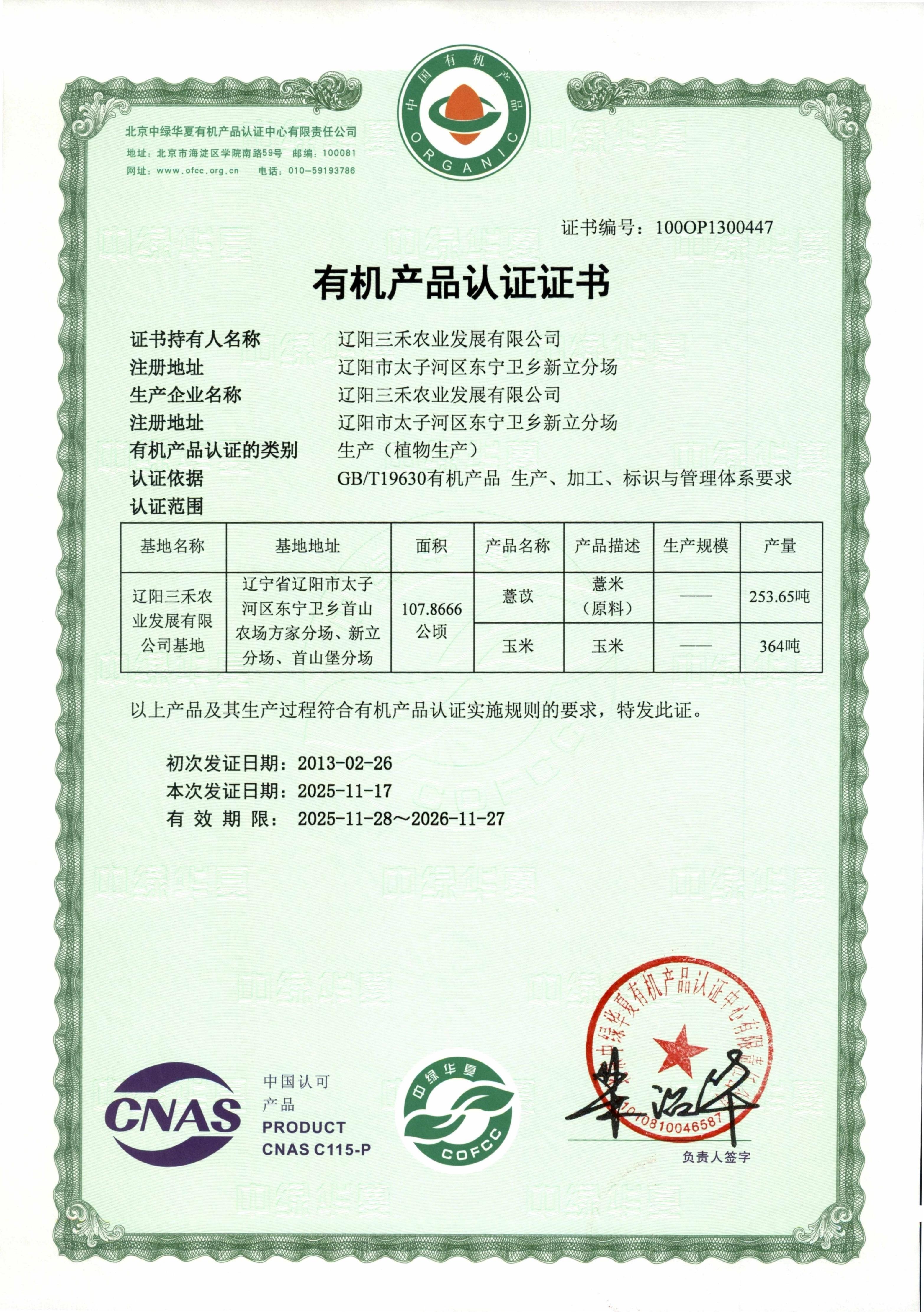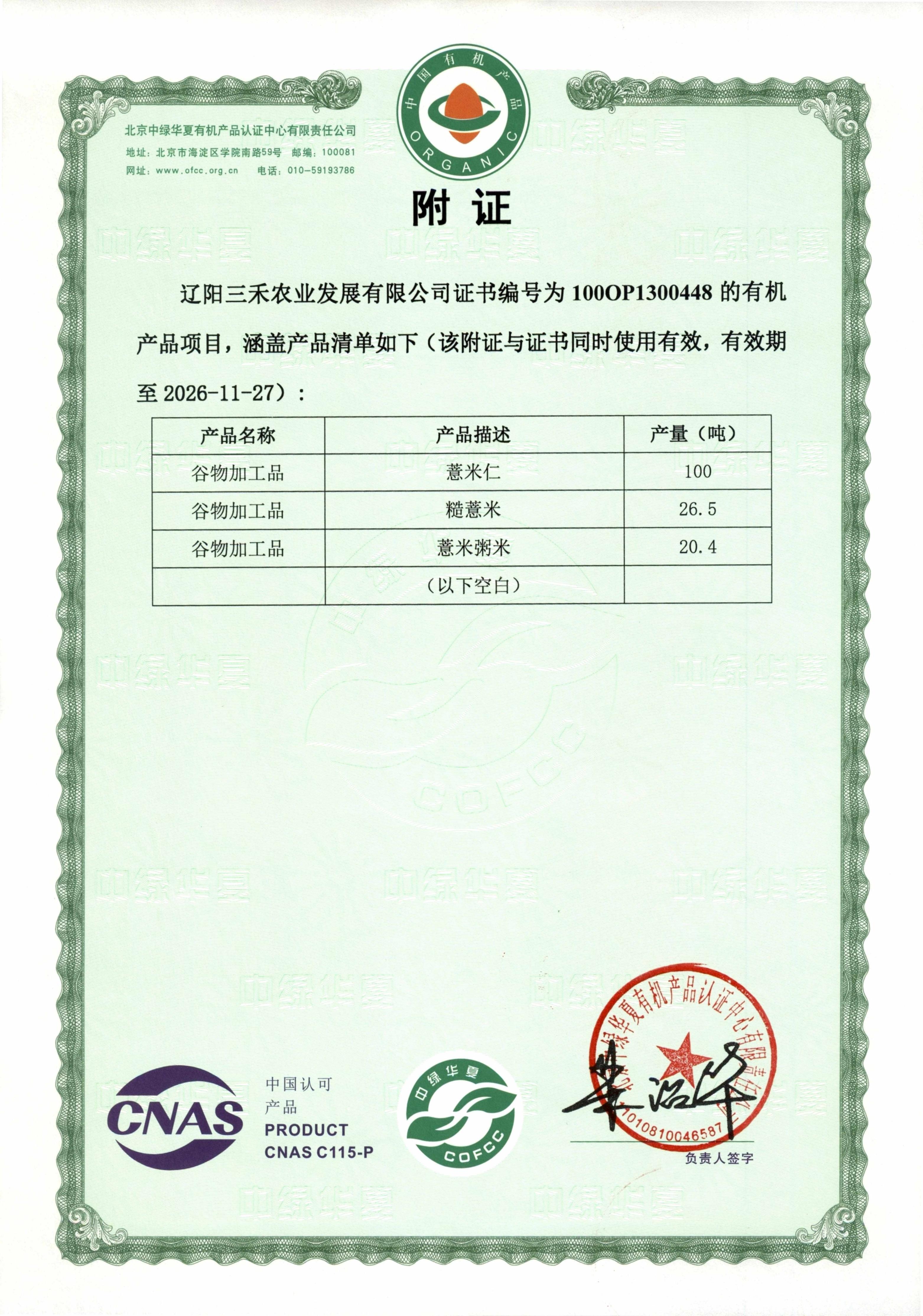 辽阳三禾农业发展有限公司在辽宁省辽阳地区建立自有有机薏米种植基地1618亩,该地区土壤肥沃,降水量充足,气候条件优越,日照充足,昼夜温差大,为薏苡种植生产提供得天独厚的自然条件。产品从选种、种植、田间管理、采收,到储存、加工、销售、运输等各环节严格按有机标准统一管理,严控农业投入品使用,与出口产品同线同标同质,质量全程可追溯,其中有机薏米已连续十年通过北京中绿华夏有机产品认证中心认证。