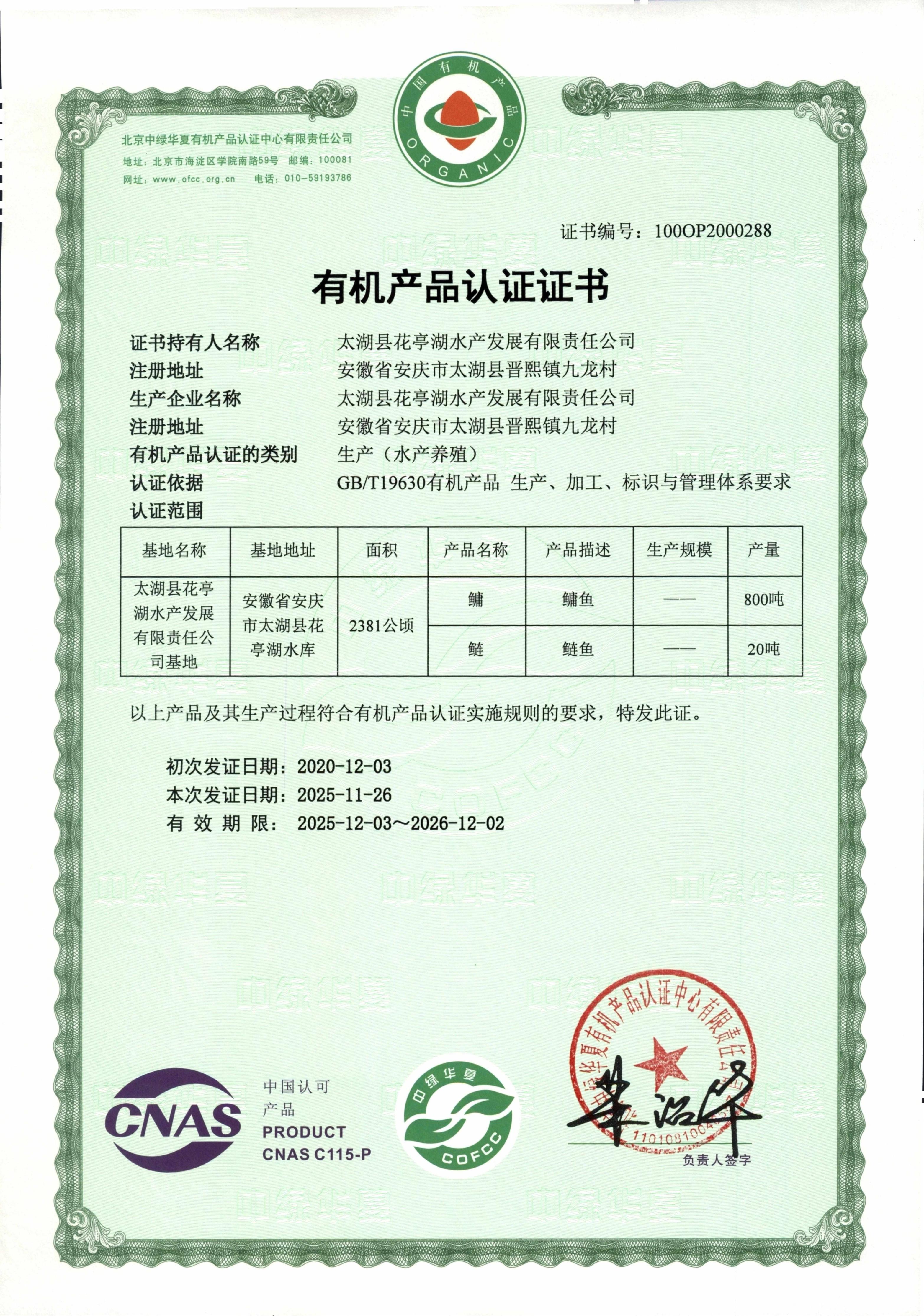 太湖县花亭湖水产发展有限责任公司水产品通过了北京中绿华夏有机产品认证中心认证,认证面积35715亩,创建了“国家级农业标准化示范区”、“全国有机农产品(鳙鱼)基地”。荣获安徽省名牌农产品、安徽省商标品牌示范企业和连续三届中国国际现代暨渔业科技博览会金奖。