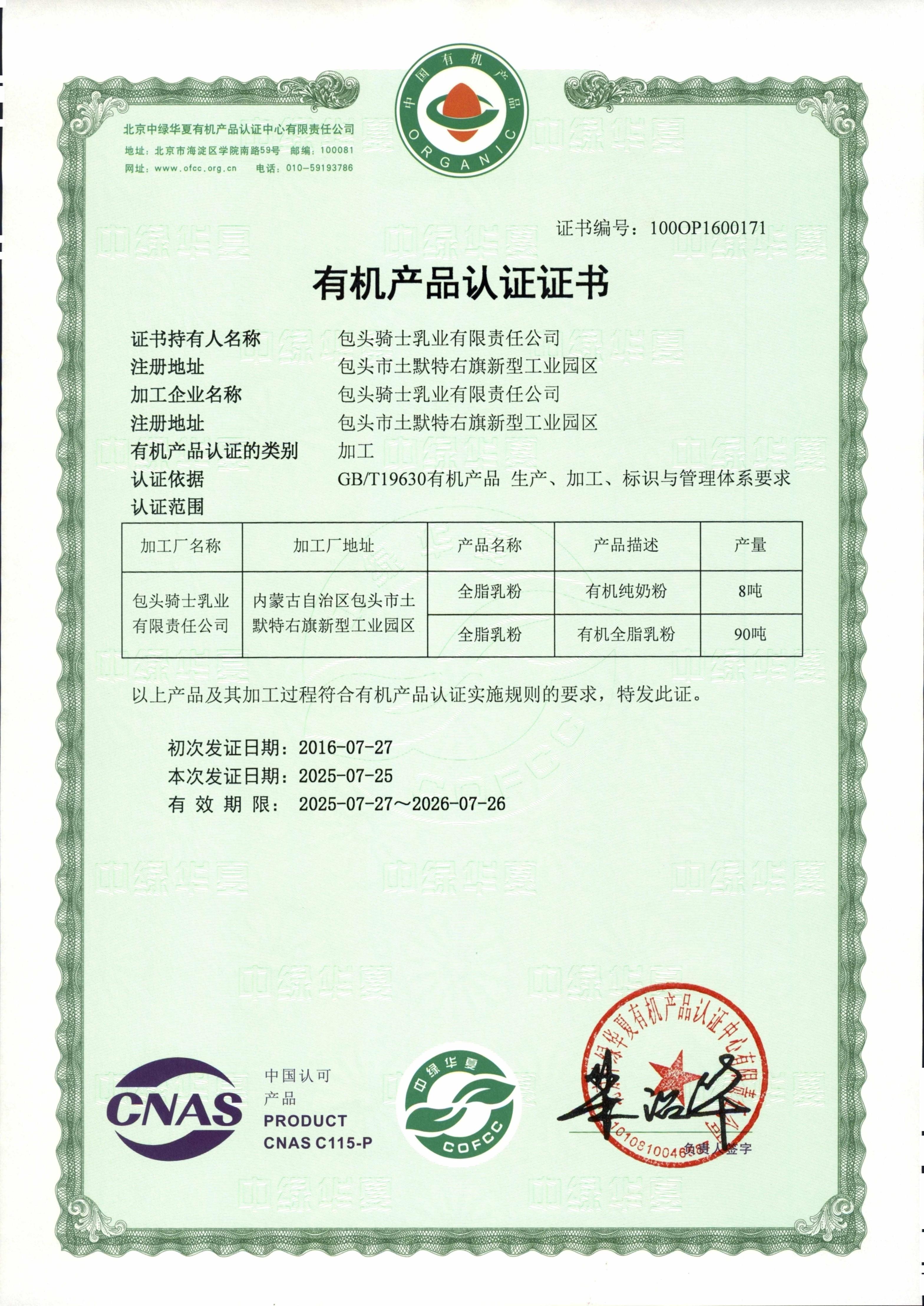 包头骑士乳业有限责任公司专注于乳业全产业链建设,持续推进“农场+牧场+工厂+市场”的全产业链经营模式。骑士有机纯奶粉采用来自骑士牧场的有机生牛乳制作而成,全程可控可追溯。“骑士”牌有机纯奶粉安全、营养、无添加,从牧草种植、奶牛饲养、生产、加工及运输的各个环节,都严格按照国家有机标准执行,并获得中绿华夏有机产品认证中心认证。