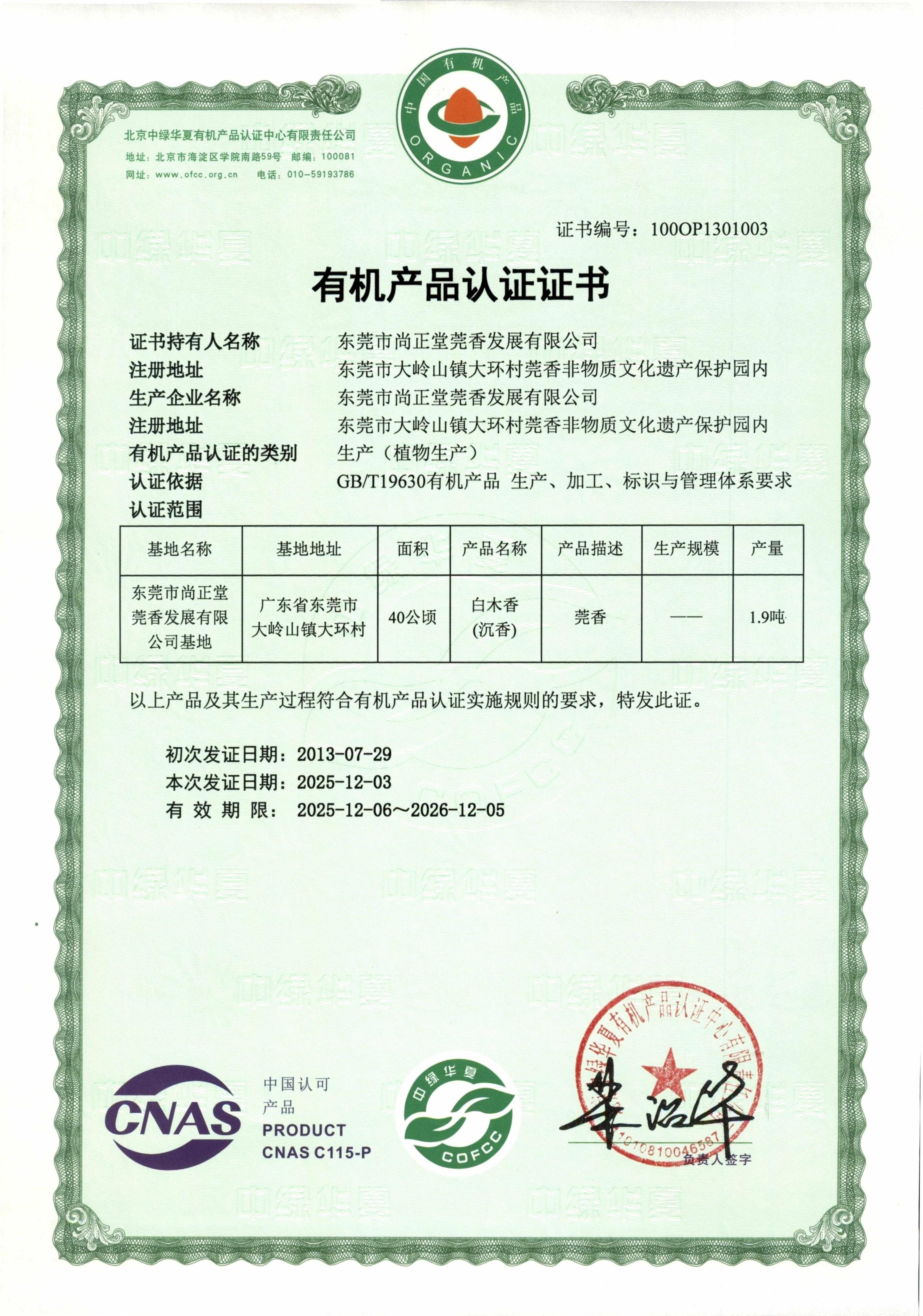 莞香是产自广东东莞并以地方命名的沉香珍品,是东莞最负盛名的地方物产,也是一种传统名贵的香药。尚正堂严格按照有机标准,规范生产流程、提高生产效率、严控过程检验、提升生产工艺,并且建立产品追溯体系,实现对莞香产品追踪溯源以及信息化、智能化管理,有效保障了各项技术的稳定性和可靠性,保障了有机莞香的产品质量,已连续十一年通过中绿华夏有机产品认证中心认证。