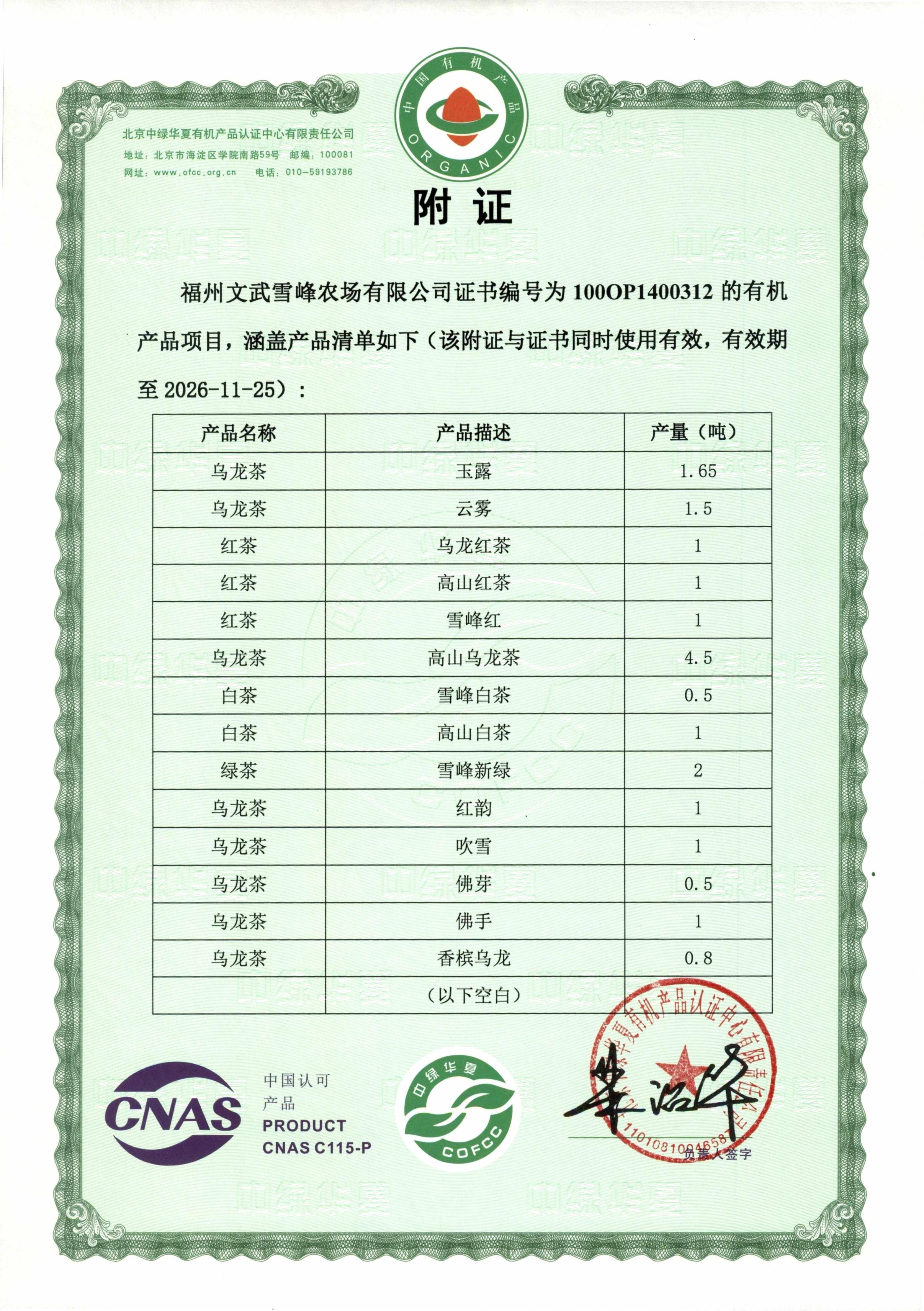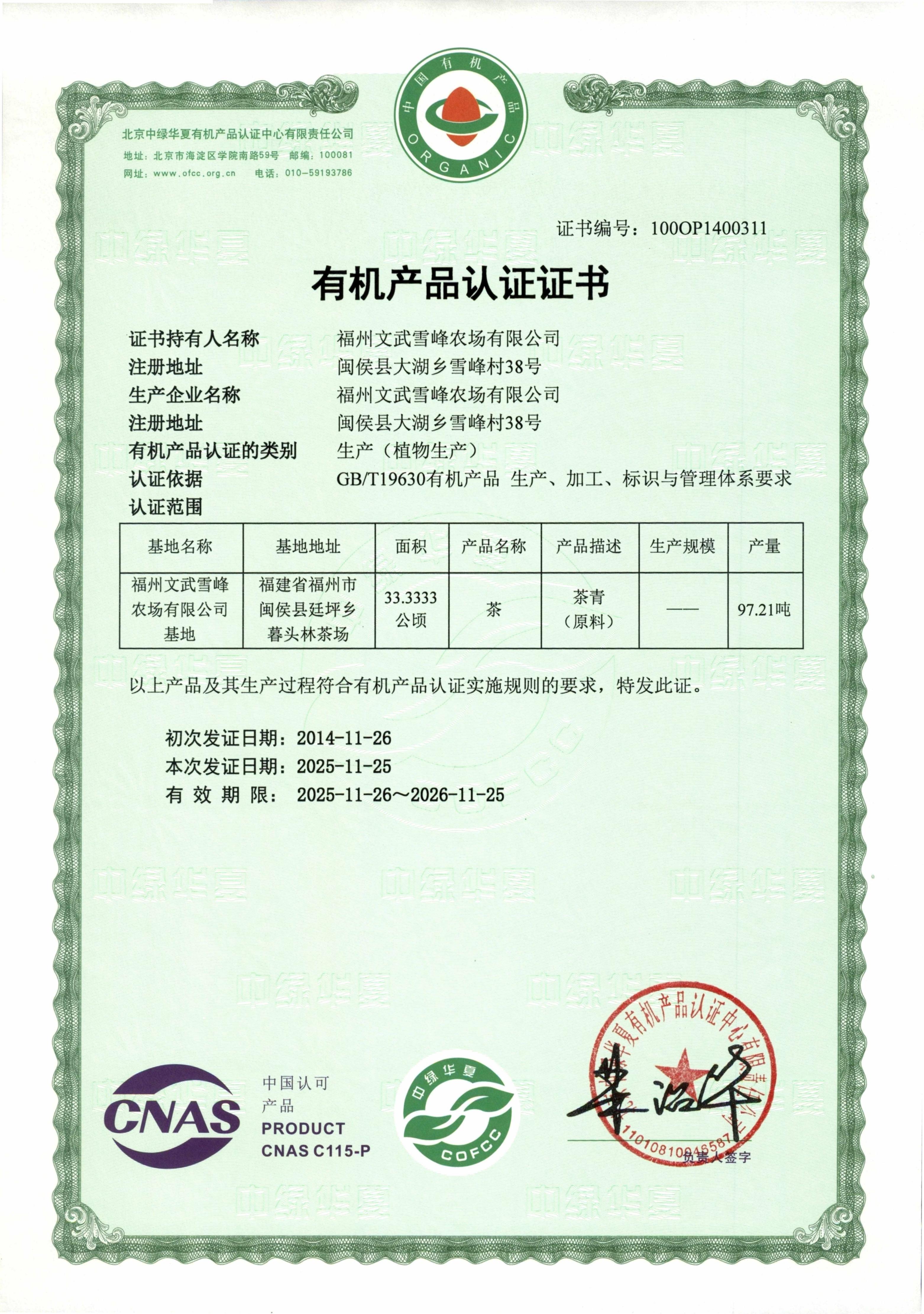 福州文武雪峰农场位于福建省福州市闽侯县大湖乡雪峰村,地处海拔1000多米高山,与南方第一丛圣雪峰寺紧依相连,茶树有机种植面积500亩,全数栽植闽台优良乌龙茶树品种,採用台式工艺及设备,并取得中绿华夏有机产品认证中心认证。