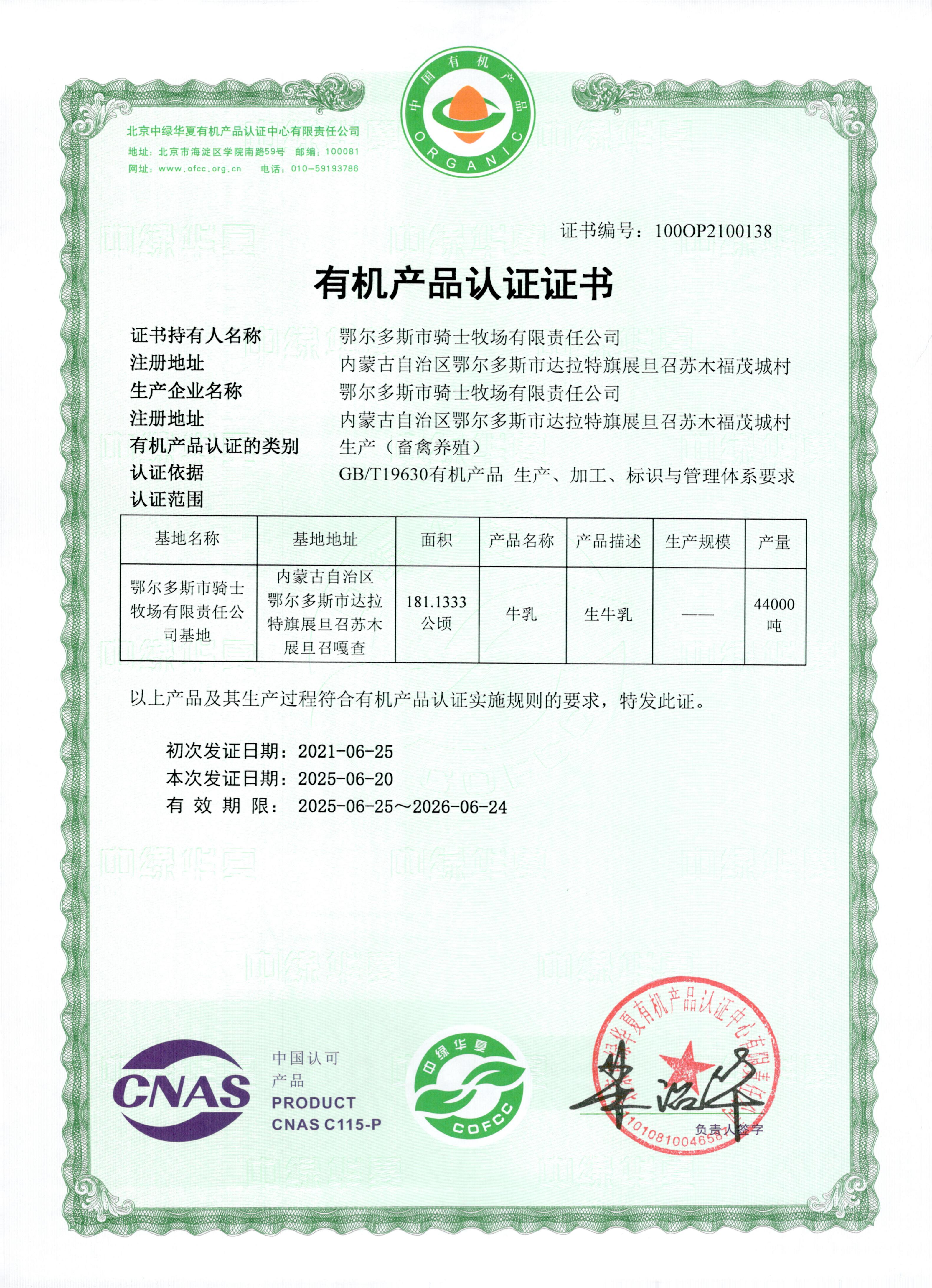 鄂尔多斯市骑士牧场有限责任公司是内蒙古骑士乳业集团股份有限公司的全资子公司,主要从事奶牛养殖、饲草种植。牧场坐落于鄂尔多斯市达拉特旗展旦召苏木,位于北纬40度的黄金奶源带,地理位置优越、交通便利,特别适合于发展奶牛养殖业。