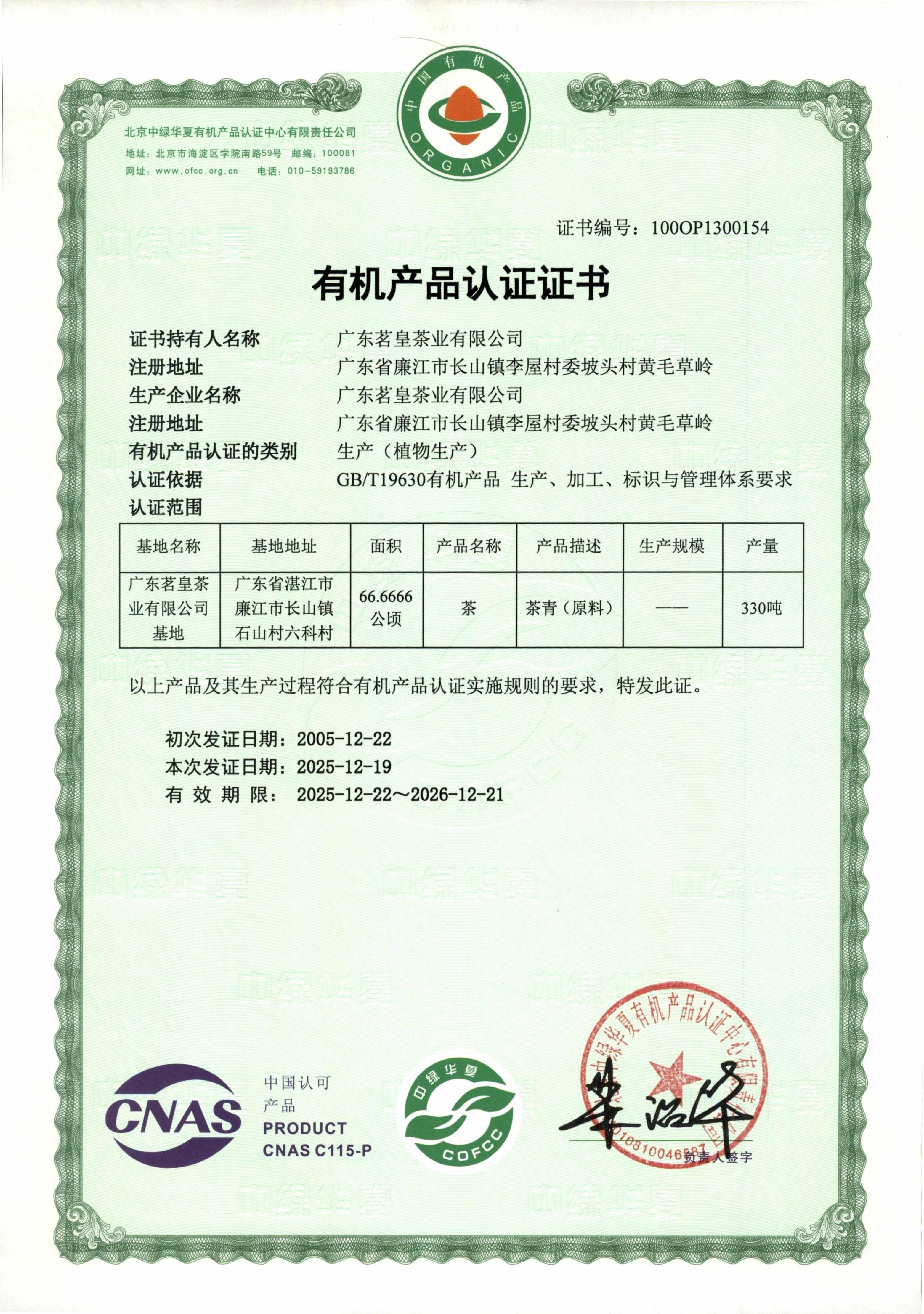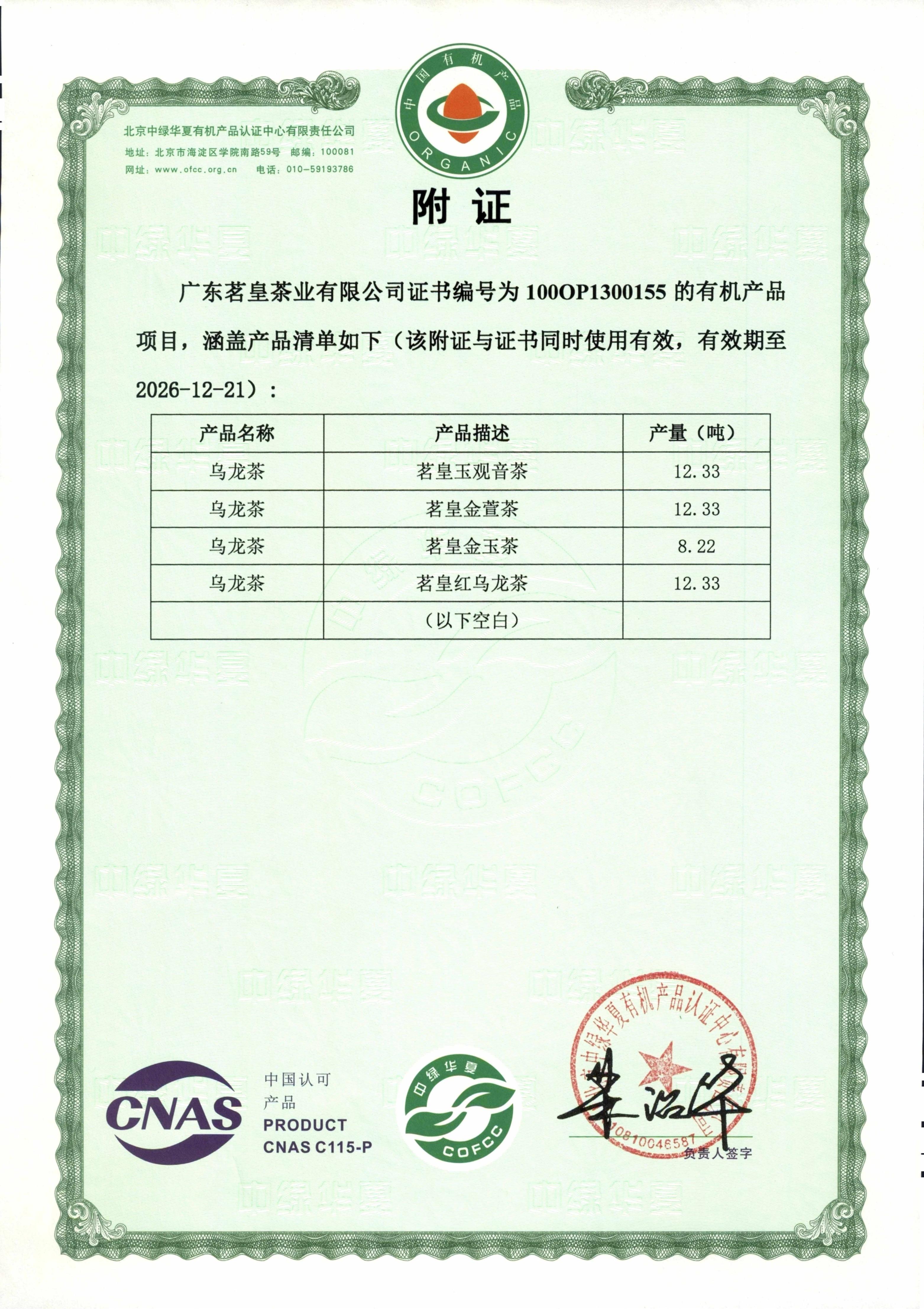 公司产品茗皇玉观音茶、茗皇金萱茶、茗皇金玉茶、茗皇红乌龙茶均已通过北京中绿华夏有机产品认证中心认证。