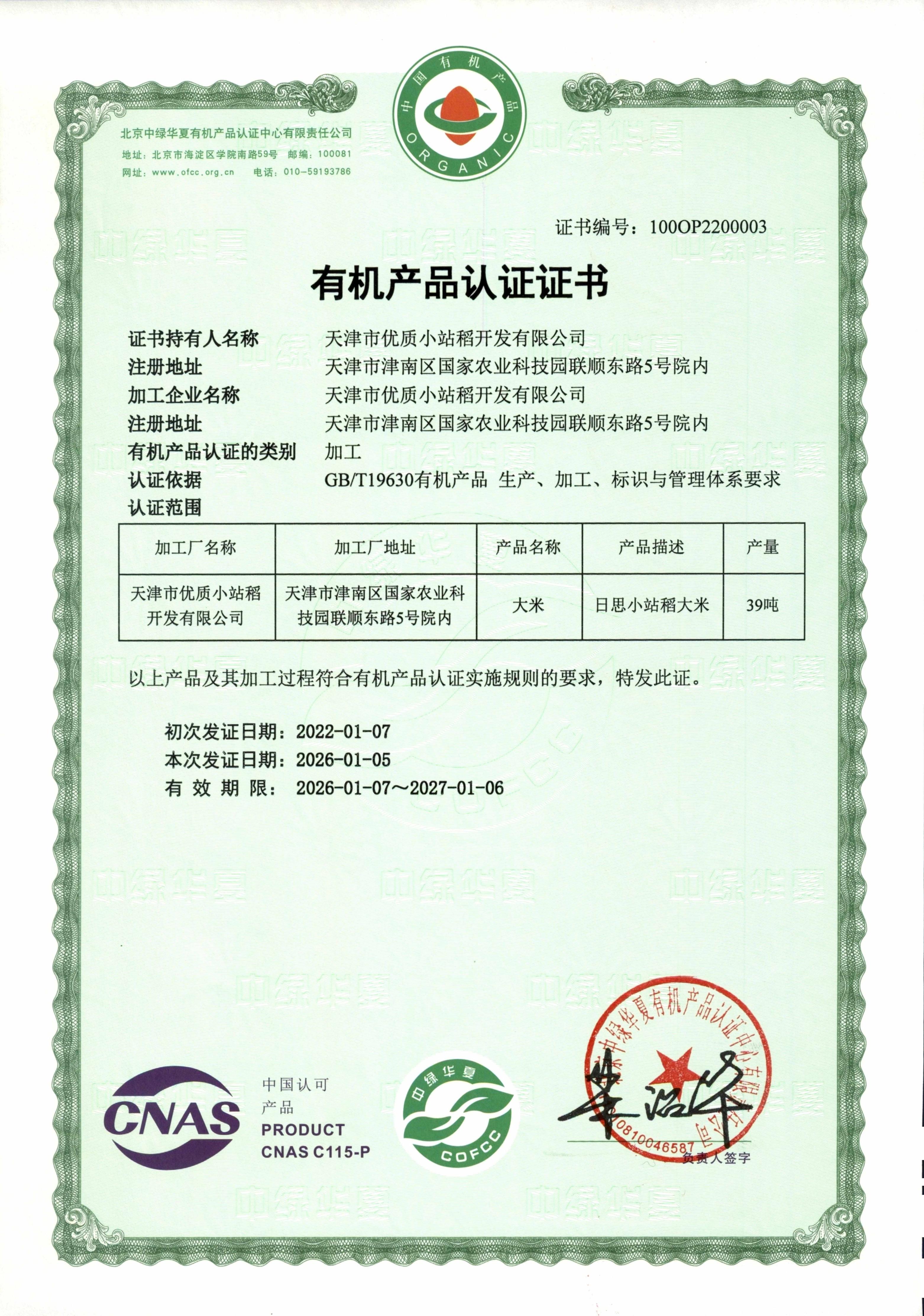 天津市优质小站稻开发有限公司的有机稻米采用生物有机肥以及生物防治病虫害、杂草等方法进行种植。加工过程中环节精细,通过两次碾米(剥壳)、两次筛选、三次色选、一次成形真空包装、一次外包装,产出有机稻米色泽晶莹透亮、口感香糯绵长、纯天然的大米,一经上市就深受消费者的青睐。近年来,天津市优质小站稻开发有限公司在高端有机稻米生产方面持续发力,所产稻米连续多年通过中绿华夏有机产品认证中心认证。
