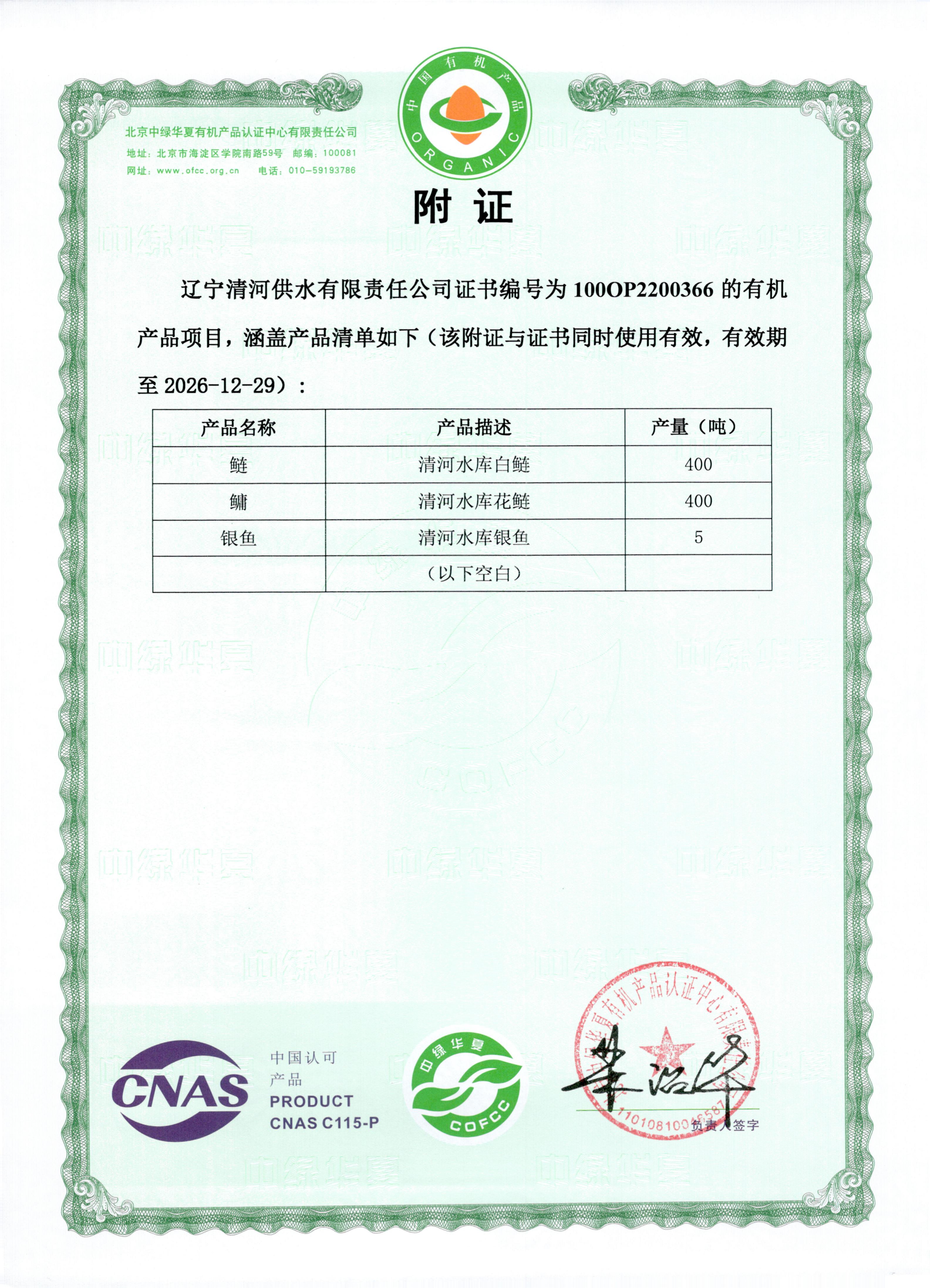 公司产品清河水库花鲢、白鲢、银鱼均已通过北京中绿华夏有机产品认证中心认证。公司从鱼苗选种到养殖捕捞全过程,一直严格遵循天然有机的养殖理念。选取的鱼苗均来自正规养殖场,经历严格筛选,谨慎投放后的鱼种在经过3至5年自然生长后才开始进行捕捞。有机鱼生长期间不投喂任何饲料,不使用任何药物。
