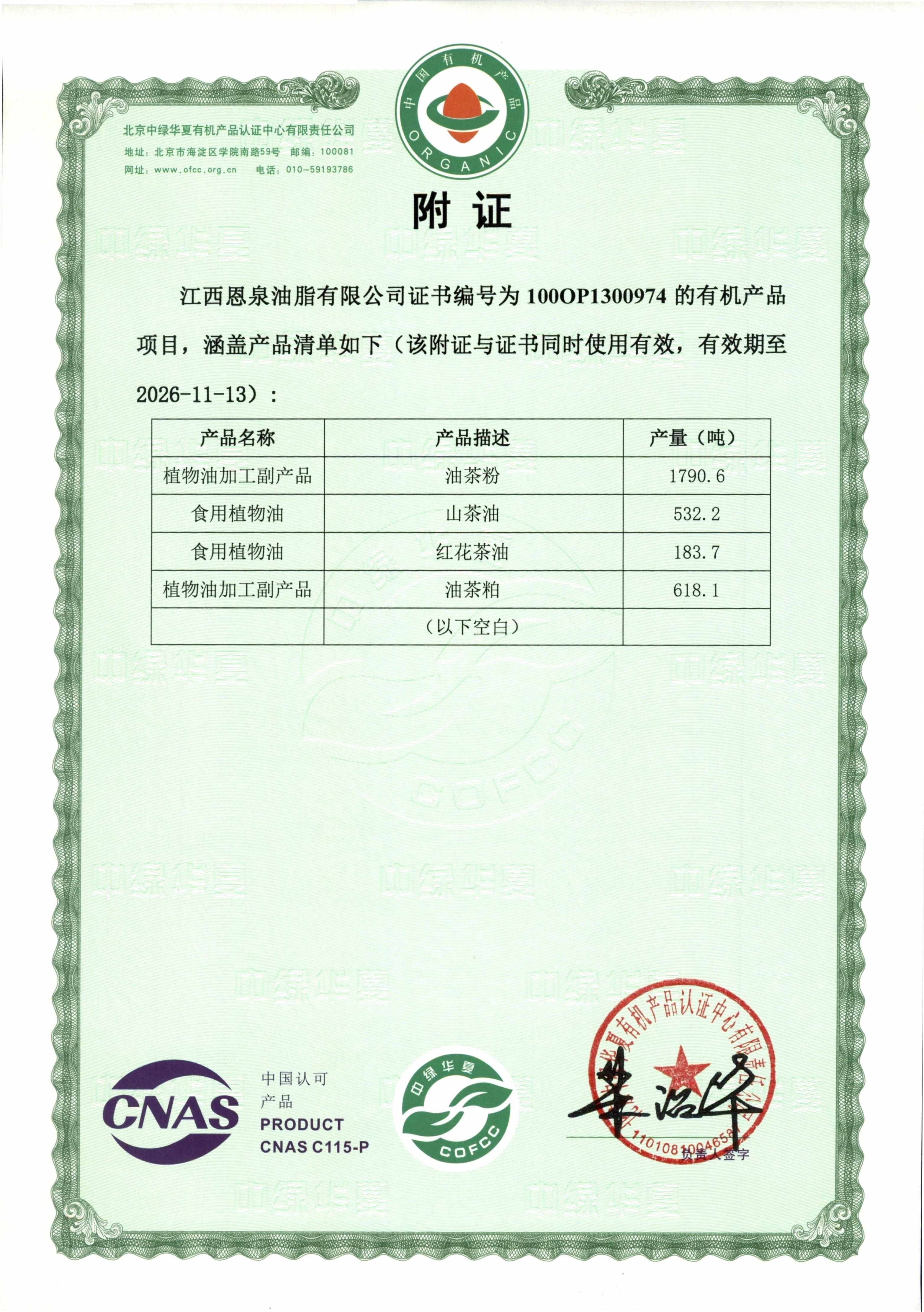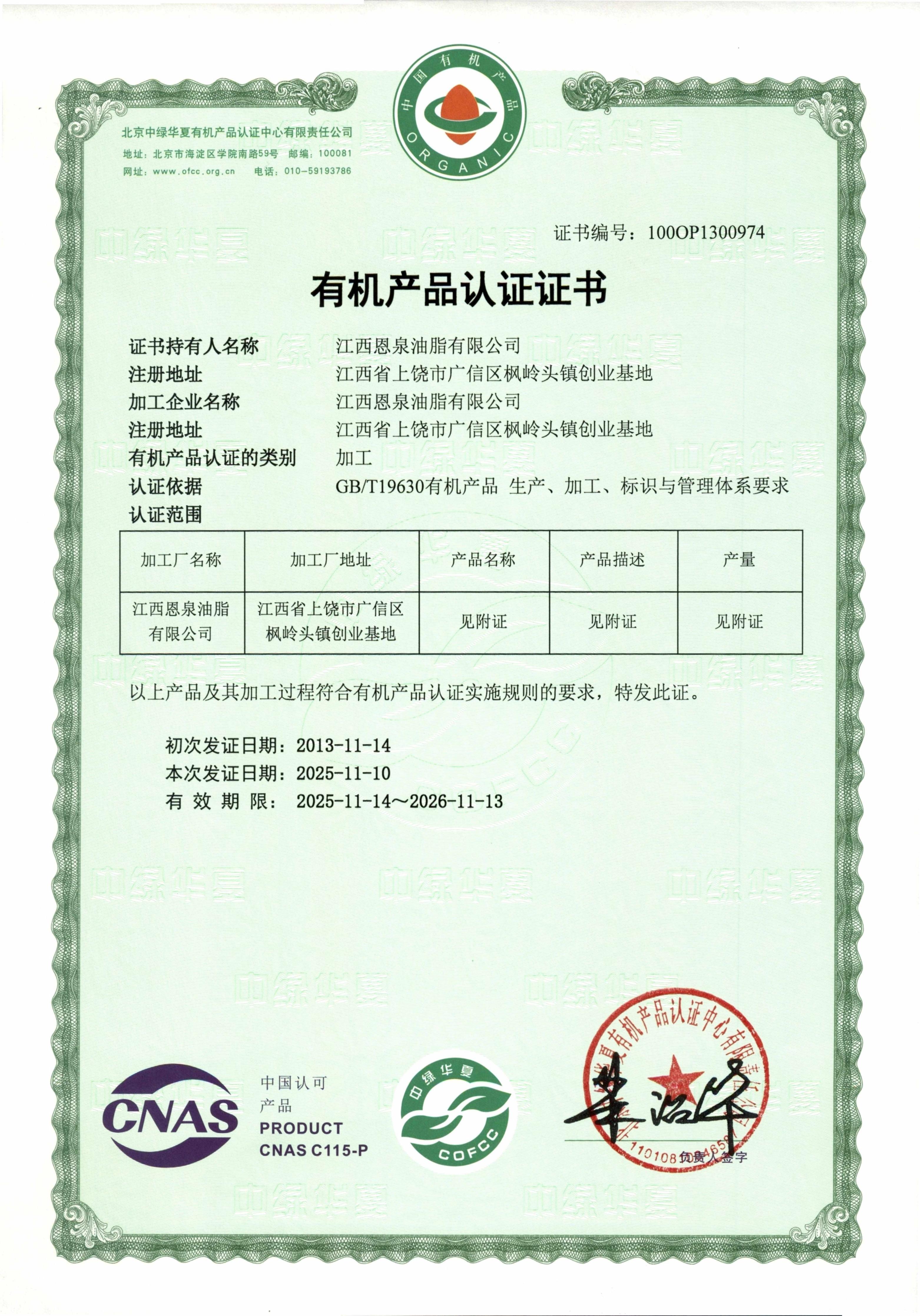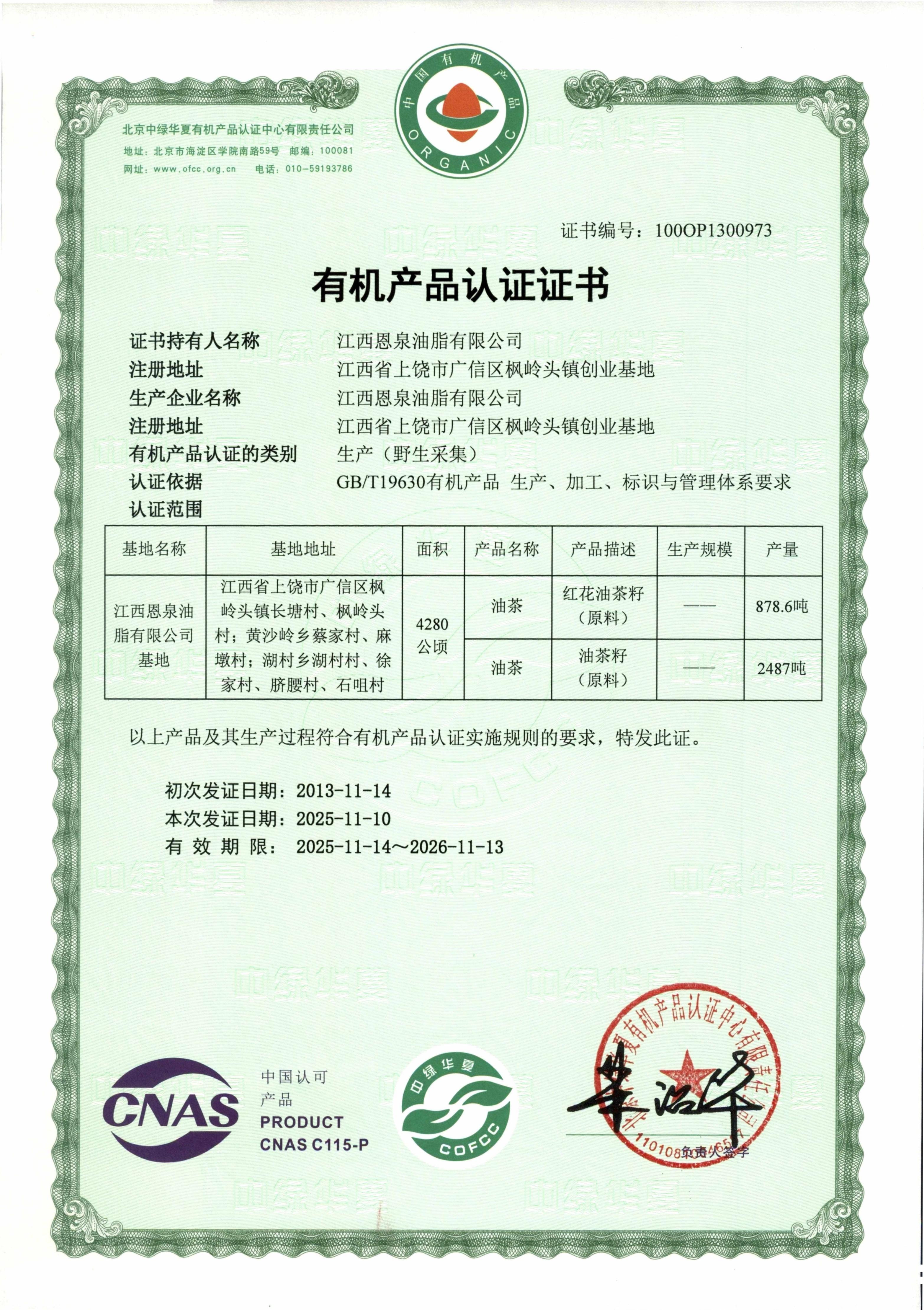 土壤是茶树生长的母体,自1979年成立,恩泉油茶便通过保留土壤本身的鲜活养分,平衡酸碱度pH值的精确点数,改良土壤品质,培育土壤生物多样性。同时,在后续发展的十年时间中建立了从原料采集、甄选、加工、检验到包装的一条龙生产体系,通过30万级空气净化、臭氧杀菌、纯物理低温压榨工艺设备,为恩泉茶油公认的品质提供有力的技术支撑。江西恩泉油脂有限公司的油茶已通过北京中绿华夏有机产品认证中心认证。