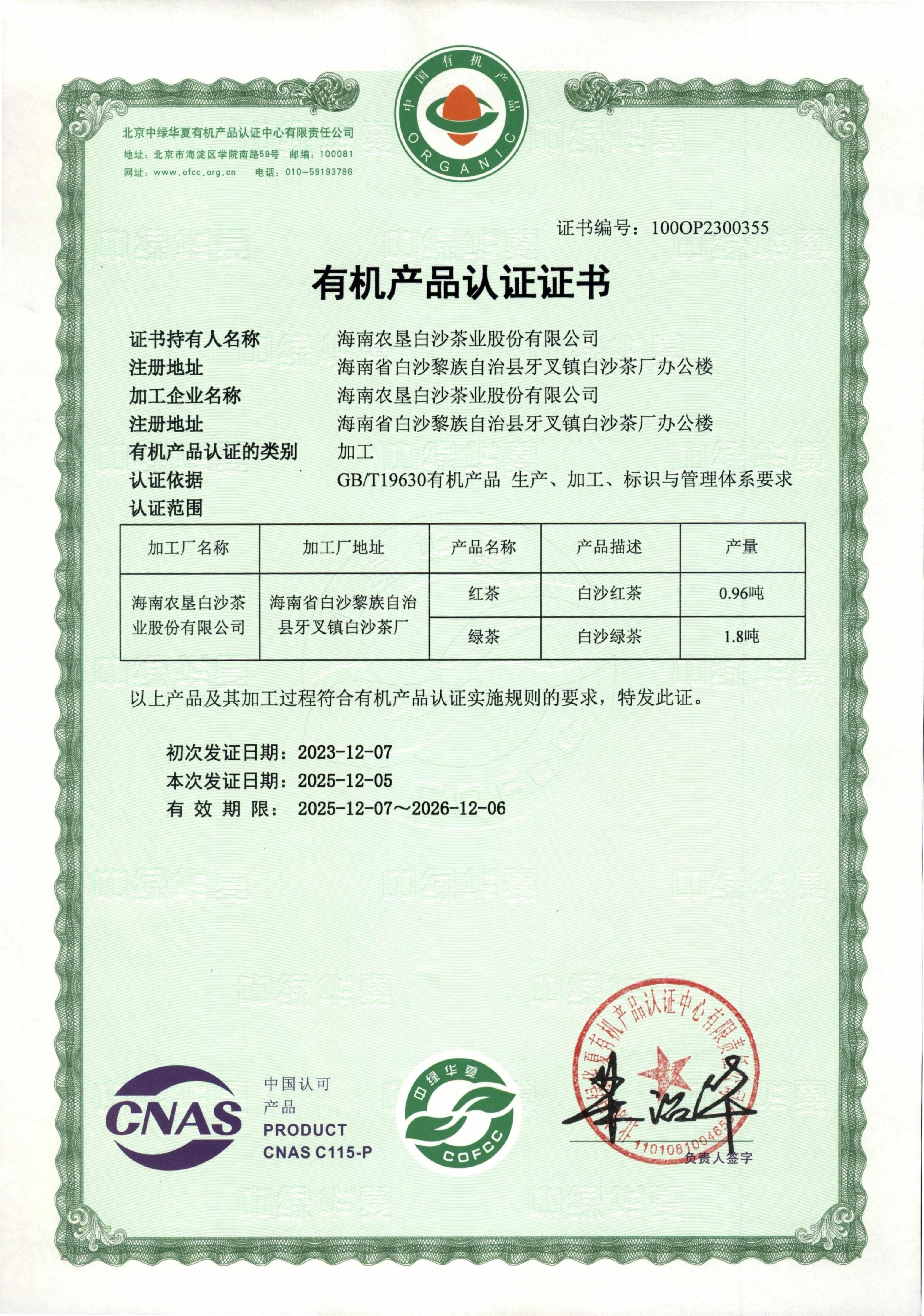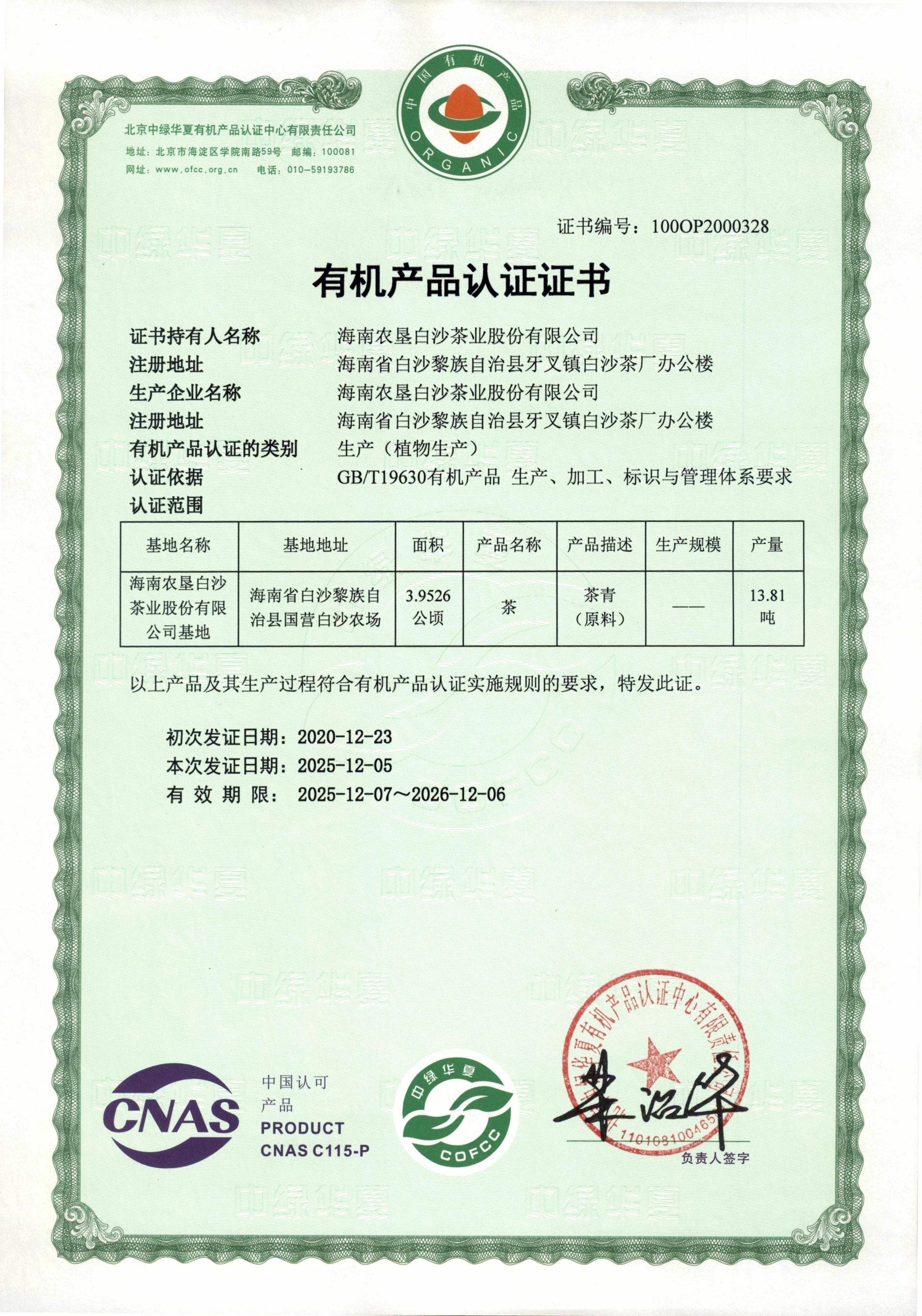 有机绿茶、有机红茶和有机茶青(原料)均已通过北京中绿华夏有机产品认证中心认证。