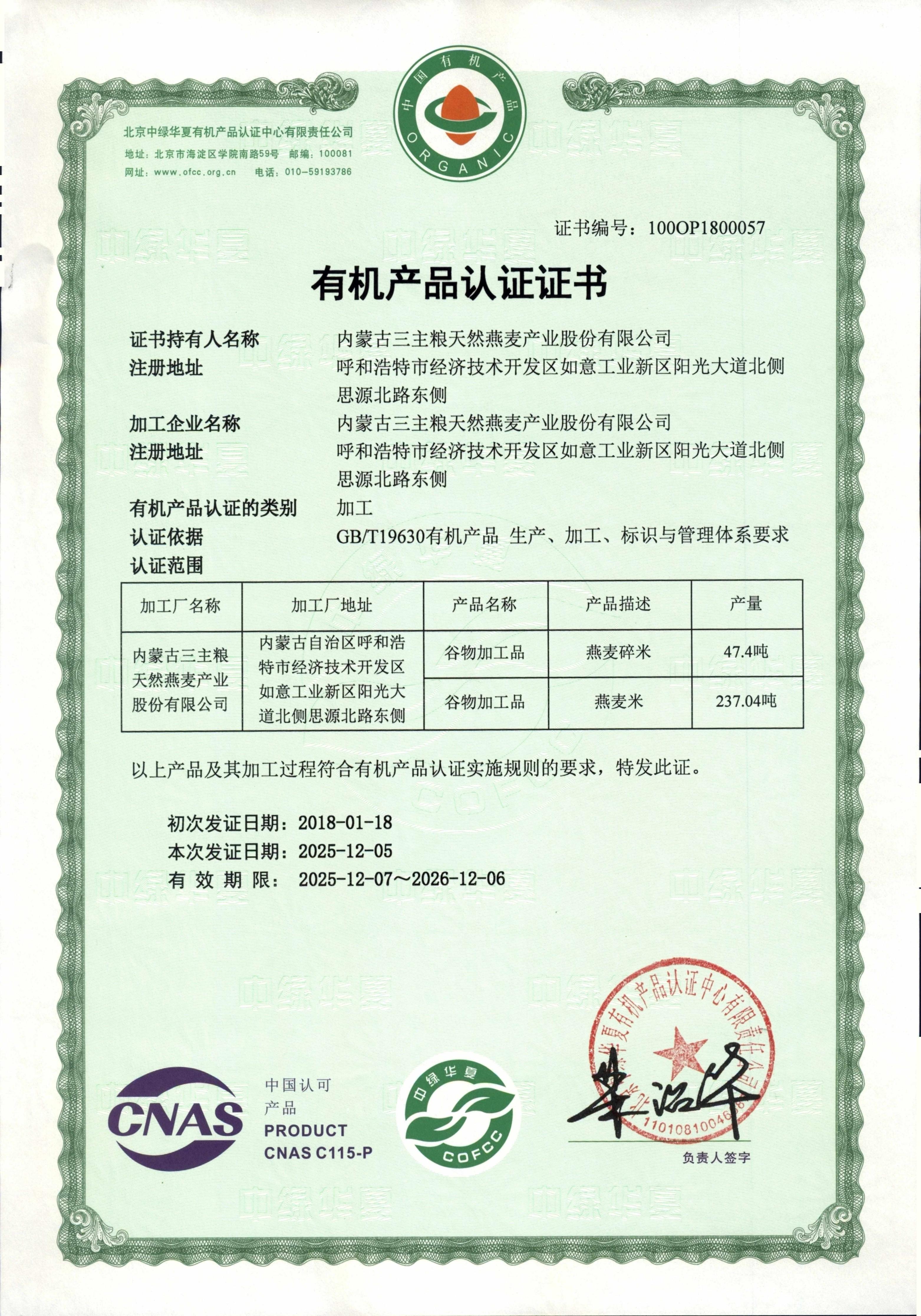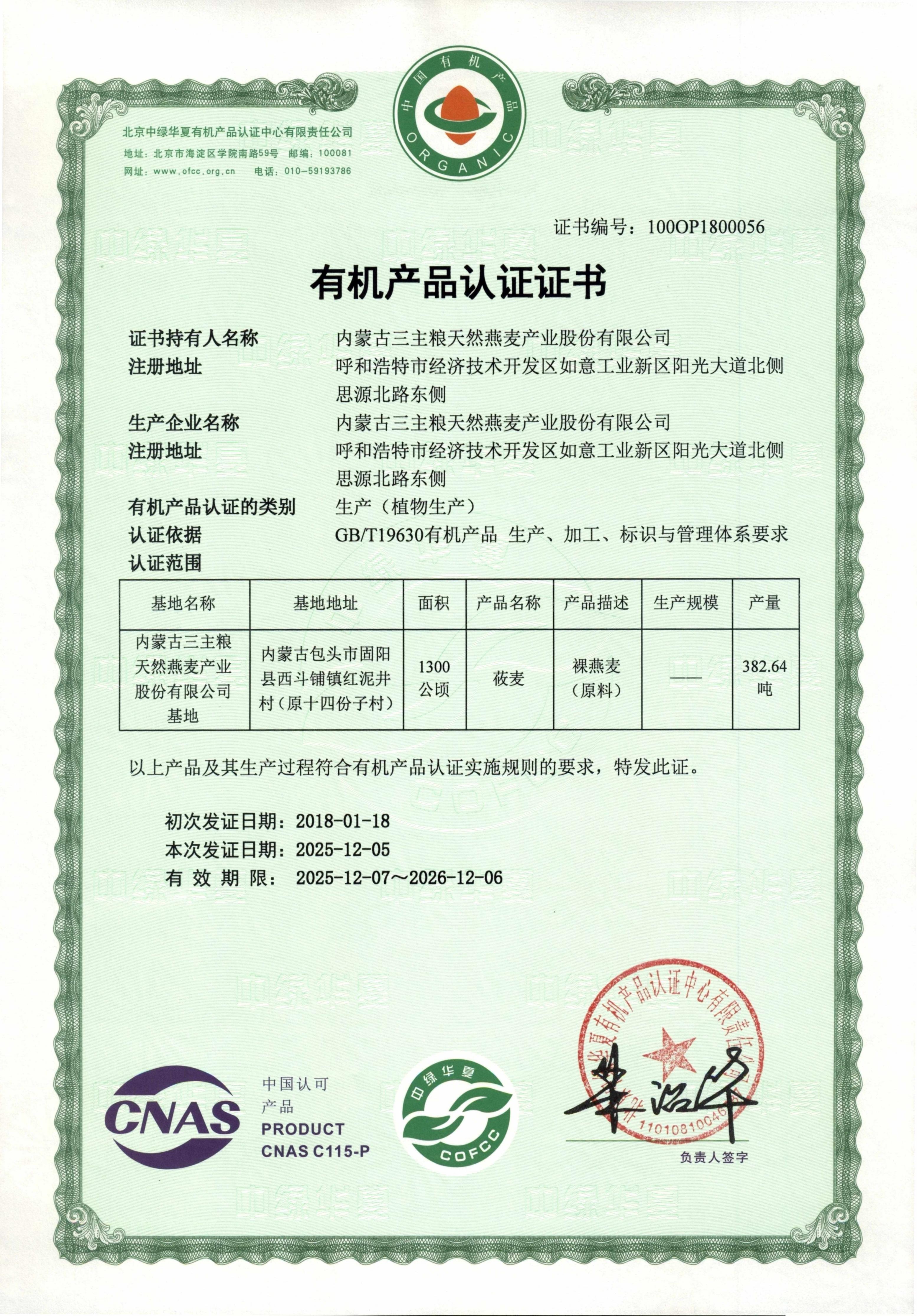 内蒙古三主粮天然燕麦产业股份有限公司(以下简称“三主粮”)是三主粮集团股份公司下属子公司之一,成立于2011年,是集天然燕麦(裸燕麦)推广种植、收购、科研、系列产品加工、销售于一体的新型生态农业高科技企业。一直以来,三主粮集团都坚持做健康食品的“守护者”,牢牢把控有机的质量安全:以健康、有机为原则进行规模化燕麦种植;打造超国标级的物理低温粮仓,确保燕麦原粮的品质;并进行自主研发,改造升级燕麦加工生产线,提升装备生产技术,健全粮食质量检测系统。从田间到餐桌,切实保障人民群众“舌尖上的安全”。目前公司通过了ISO9001质量管理体系认证和ISO22000食品安全管理体系认证,产品获得中绿华夏有机产品认证中心、德国BCS双有机认证。