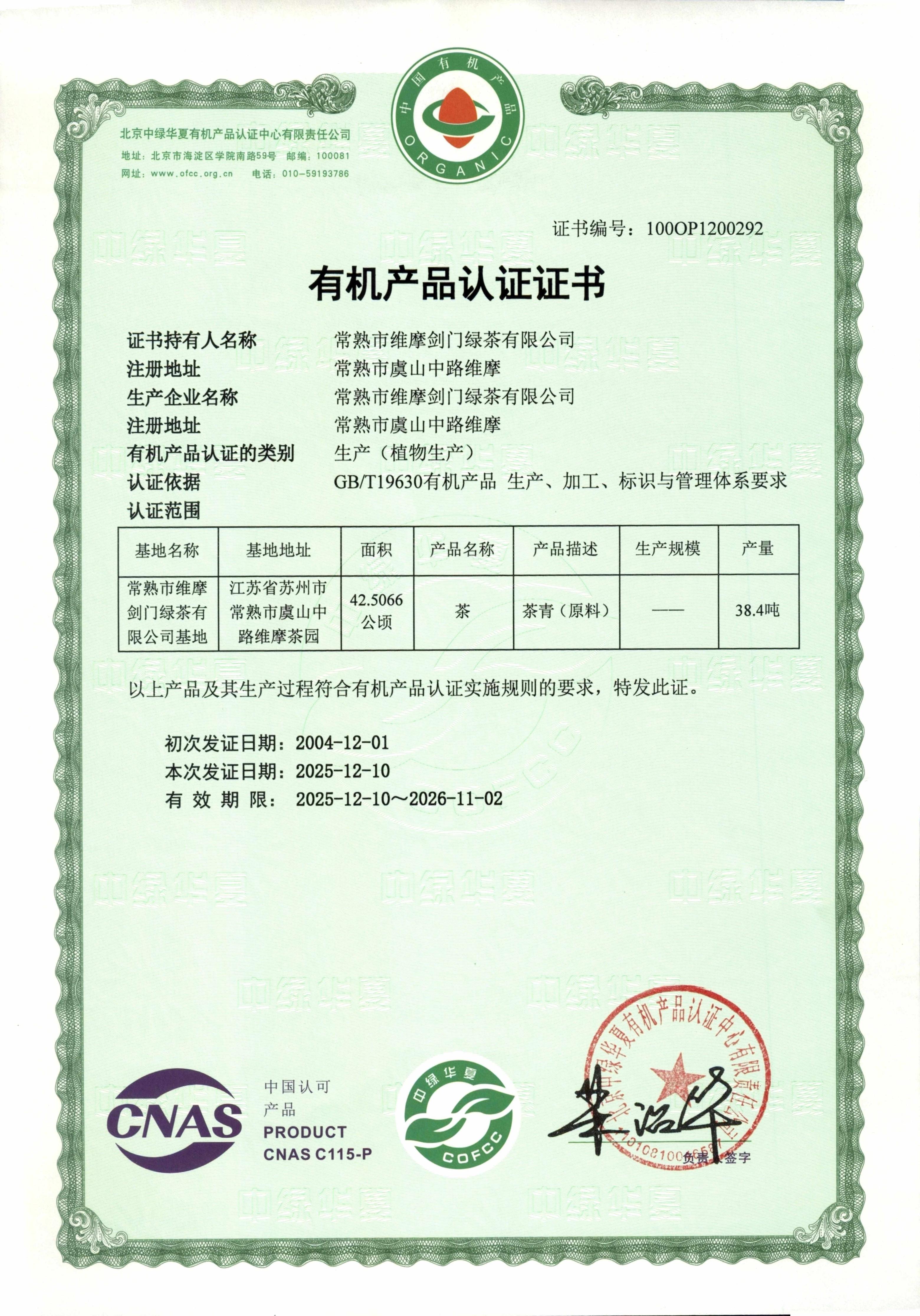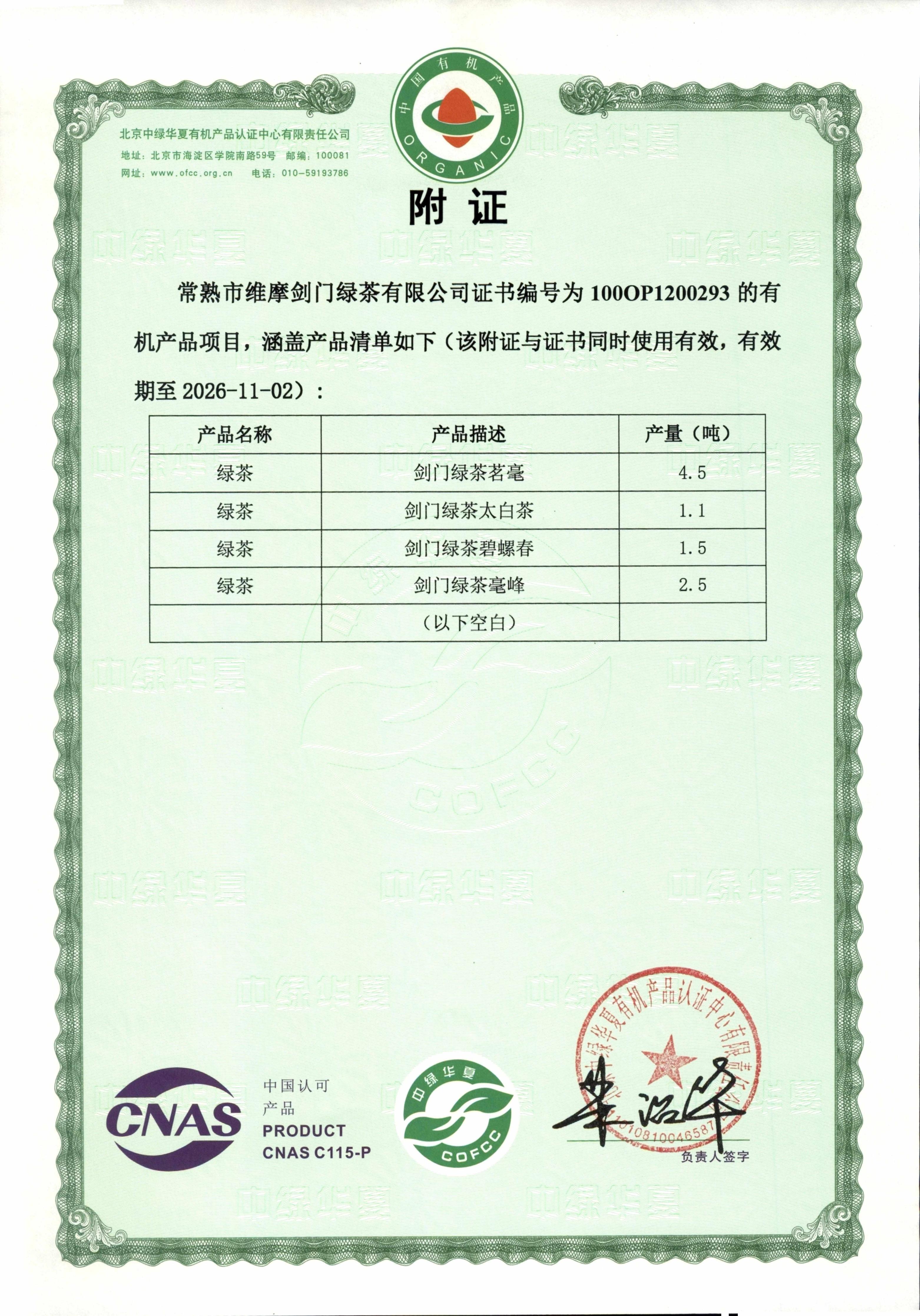 公司产品剑门绿茶茗毫、剑门绿茶太白茶、剑门绿茶碧螺春、剑门绿茶毫峰、剑门绿茶特级均已通过北京中绿华夏有机产品认证中心认证。