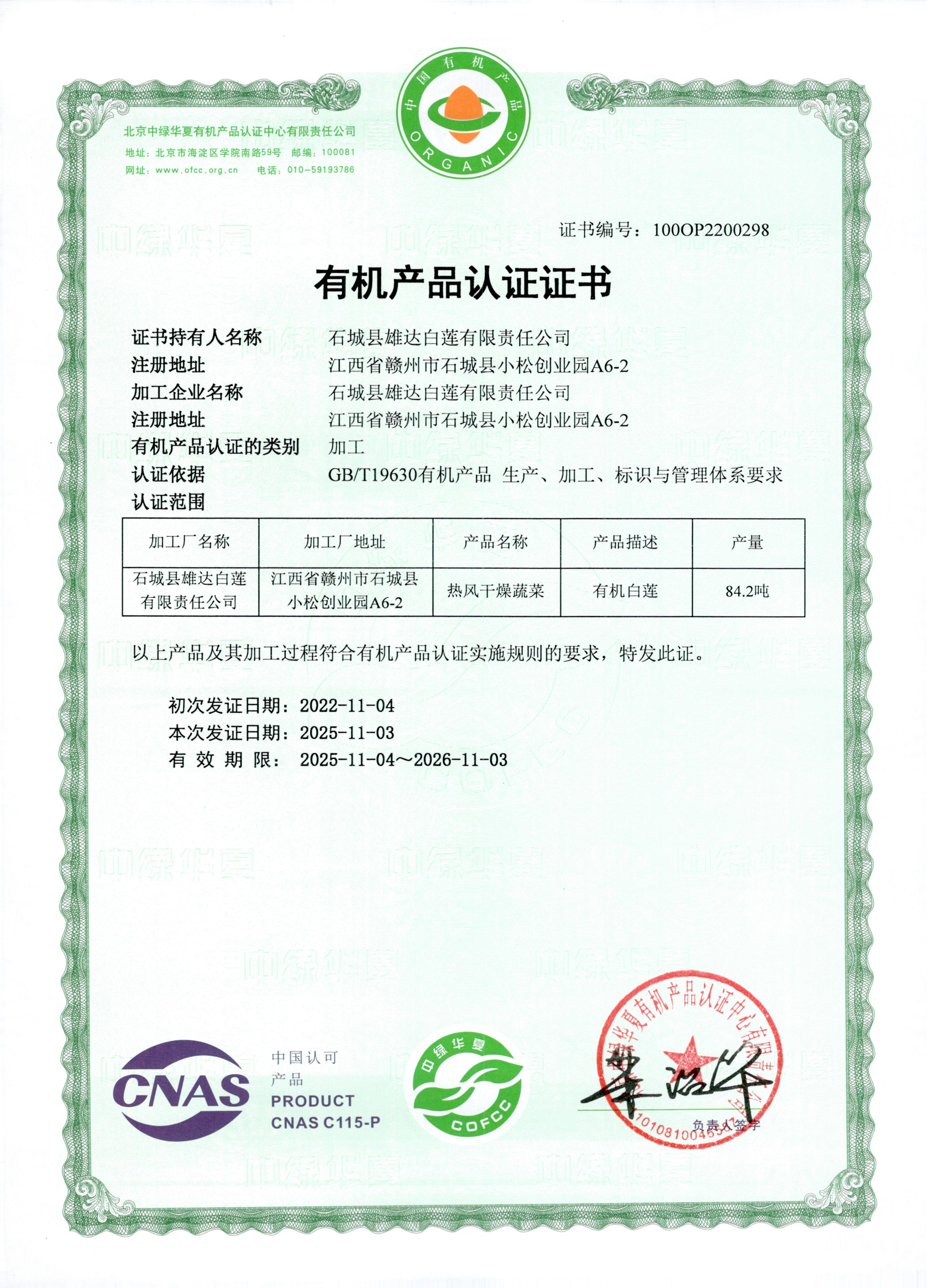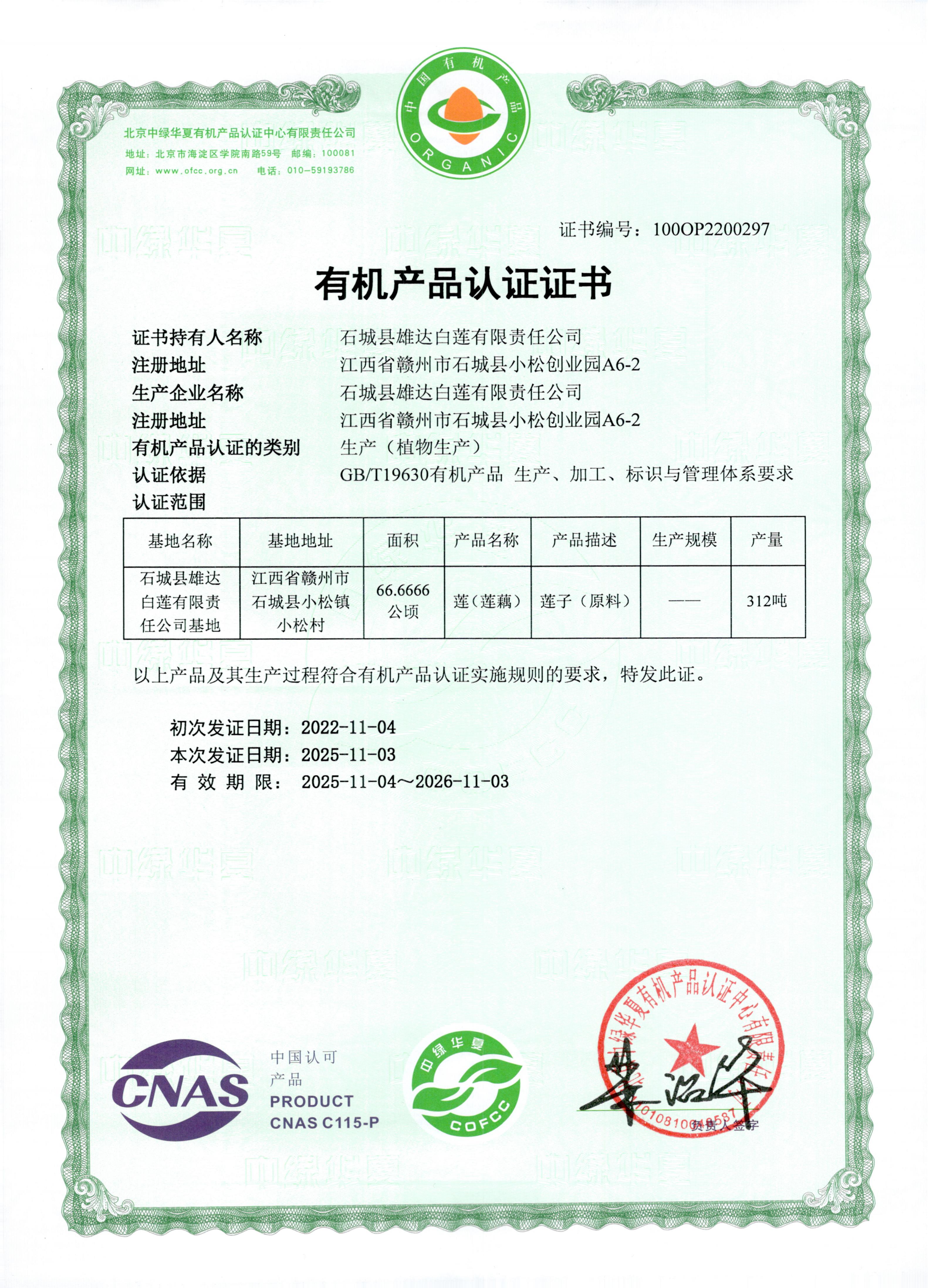 石城县雄达白莲有限责任公司成立于2002年,位于江西省赣州市。公司致力于白莲的种植、收购、加工及销售。公司年产量达到1500吨,主要产品包括白莲和磨皮白莲两大类。自公司成立以来,“以质量求生存、以诚信谋发展”的企业理念一直是经营的宗旨,始终将产品质量视为企业的生命线。经过20多年的不懈努力,白莲系列产品先后获得有机产品认证、全国名特优新农产品、赣鄱正品认证等多项荣誉。有机白莲基地荣批“全国有机农产品基地”。