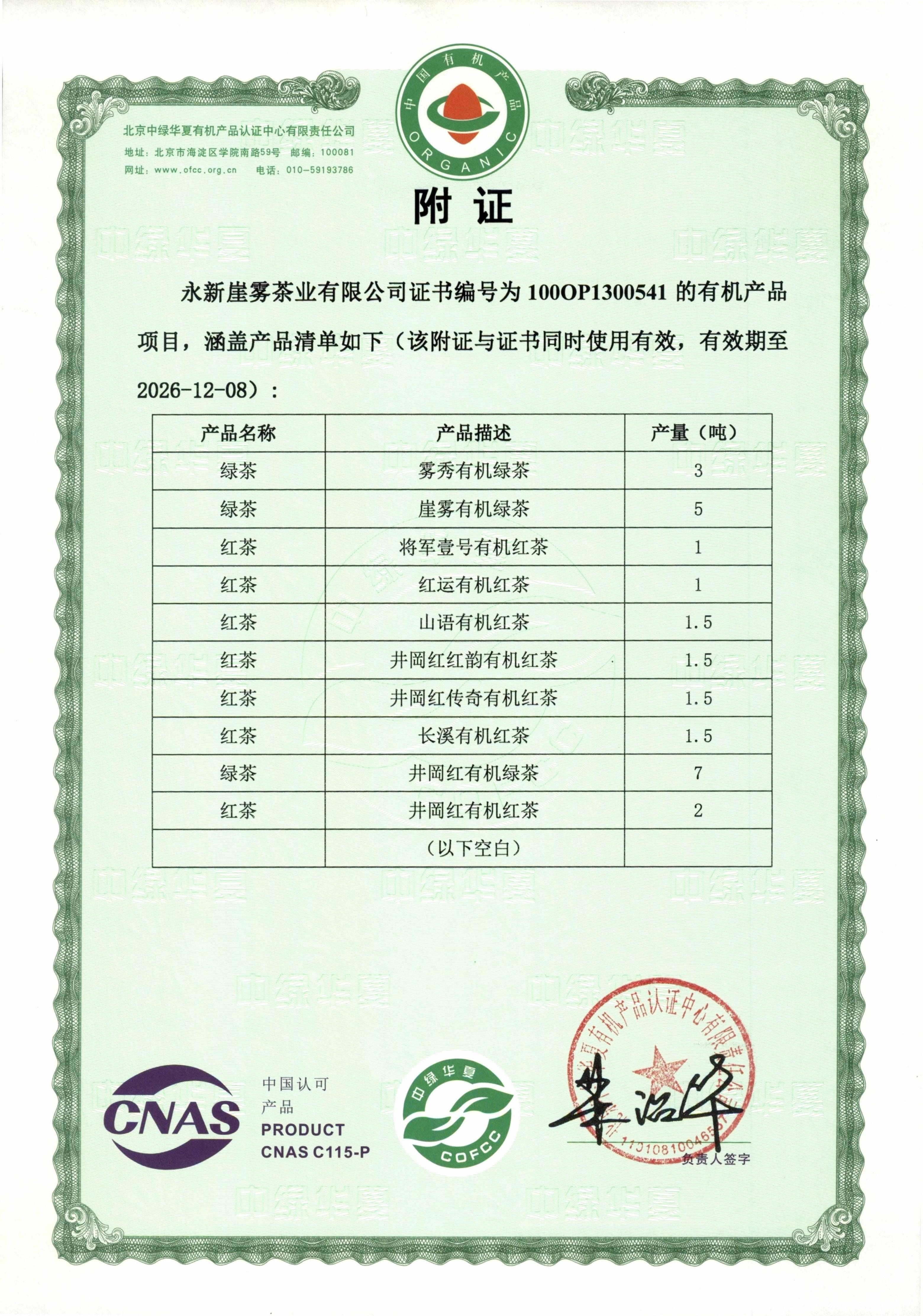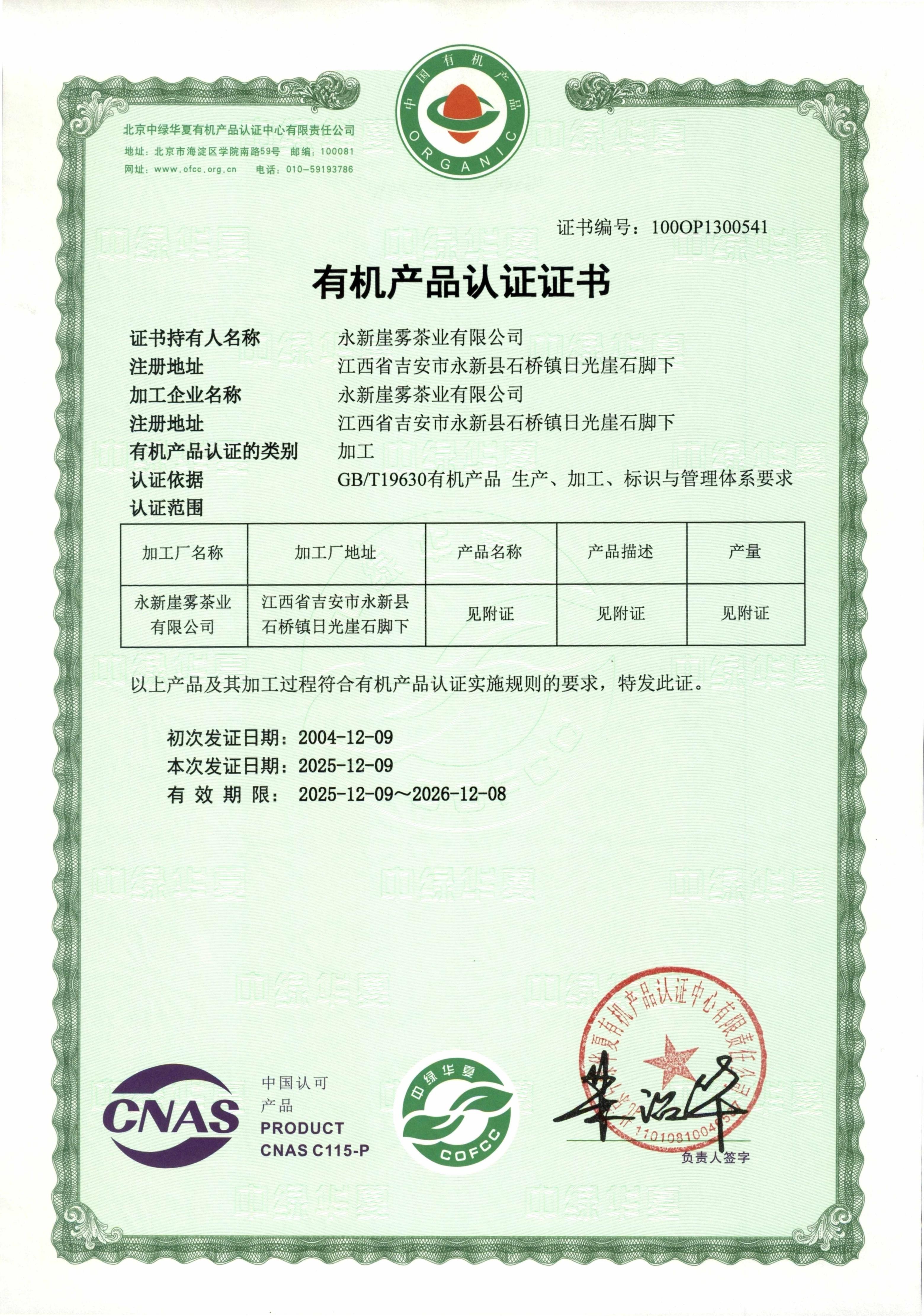 永新崖雾茶业有限公司是集茶叶种植、生产、加工、科研、销售及贸易为一体的农业产业化经营龙头企业。永新崖雾茶园严格按照有机标准管理,实施病虫害绿色防控技术,不施用任何化肥和农药。自2004年以来连续20年获得中绿华夏有机产品认证中心认证。有机认证面积1011.8亩,是赣中茶区乃至江西省最大的连片有机茶自然生态基地。