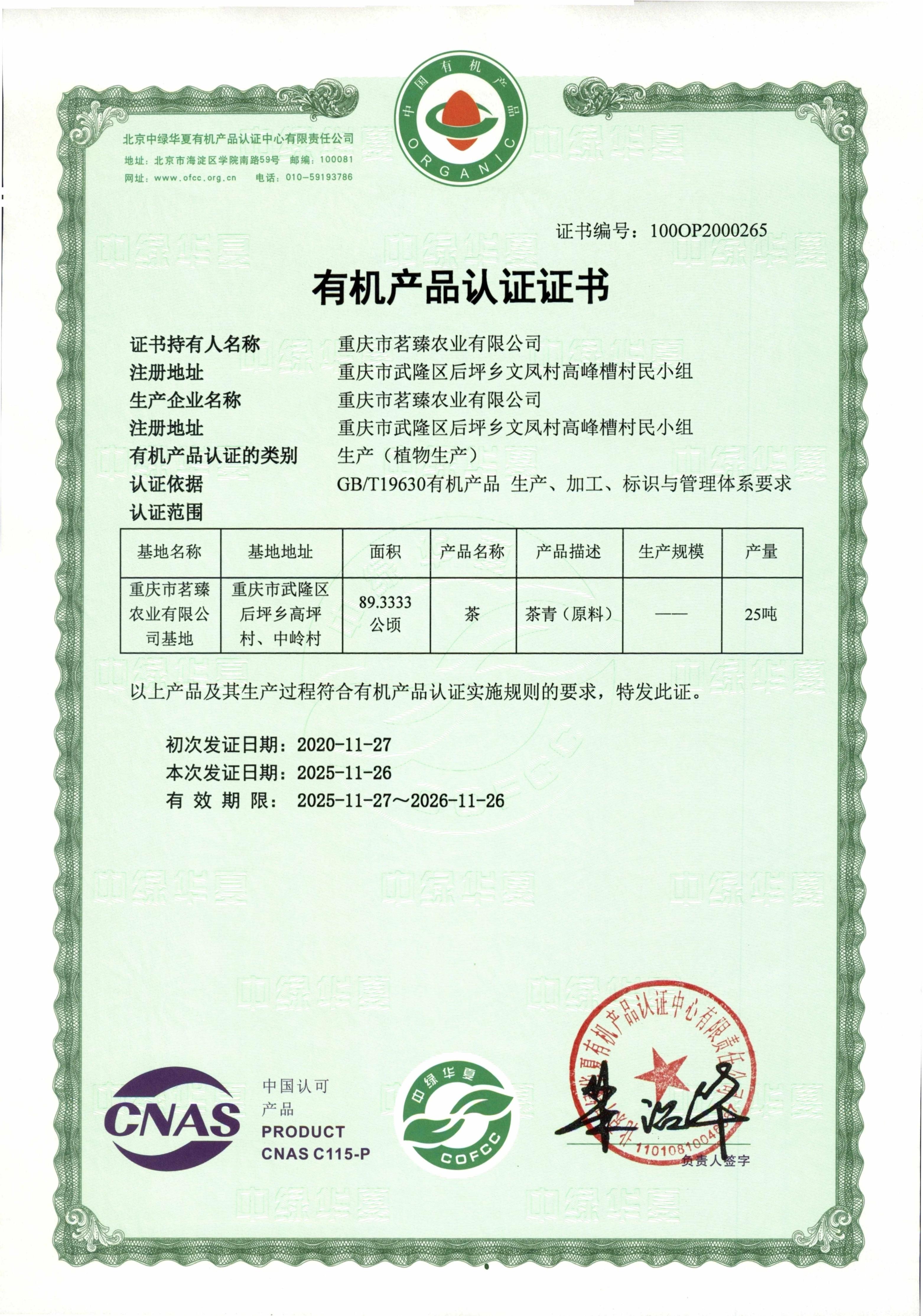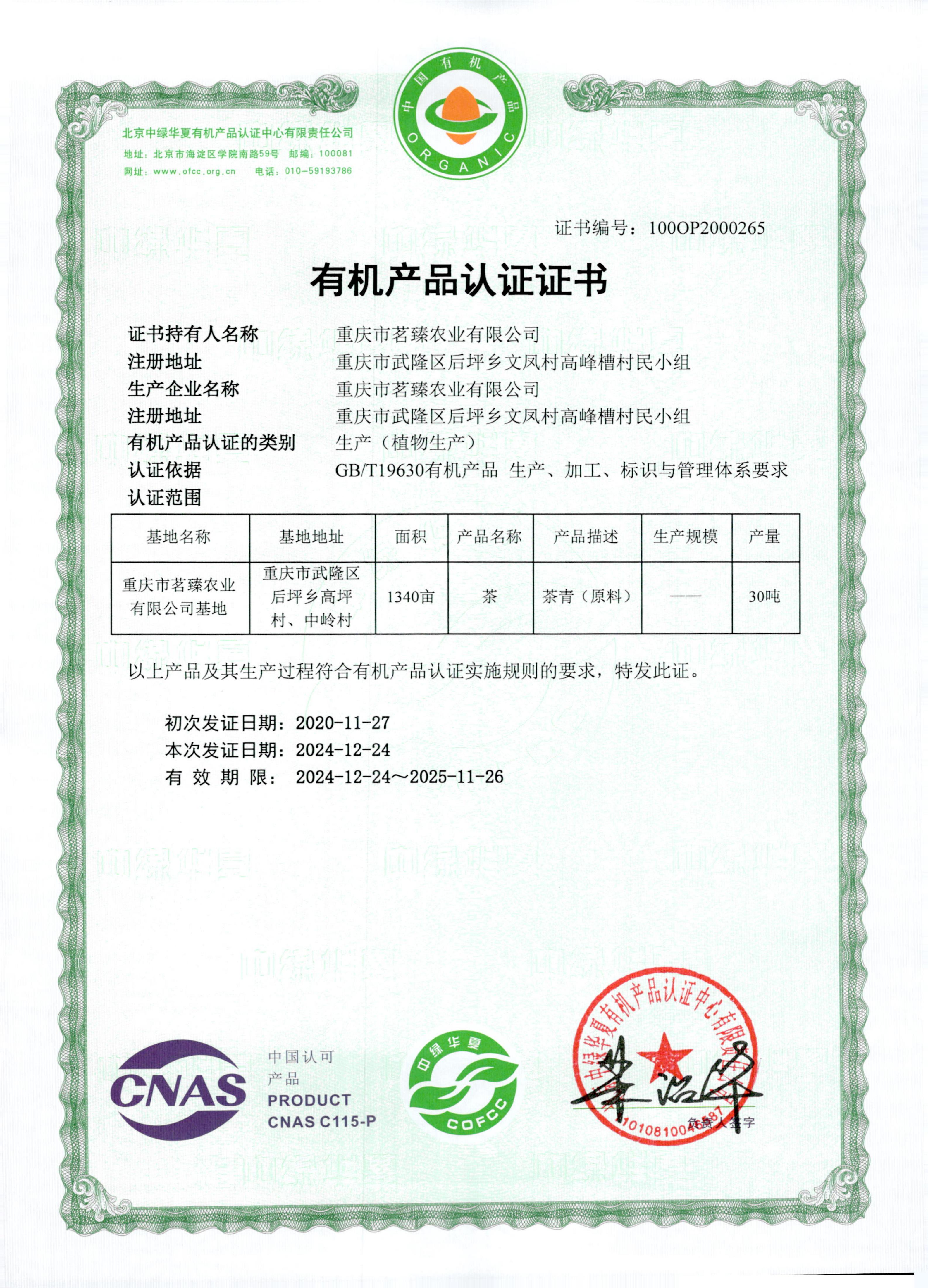重庆市茗臻农业有限公司致力于有机茶的种植、生产与销售,秉持着对品质的执着追求和对自然的敬畏之心,在茶行业崭露头角。茶园种植基地位于海拔1000米以上的高山区域,森林覆盖率超60%,四季分明,年平均气温15~18℃,无霜期240~285天,年降水 量1000~1200毫米,土壤为弱酸性石砾土壤,土壤风化比较完全,石砾较多,土壤通透性好,且有机质和茶树生长所需各种矿质营养元素一应俱全,适宜作为有机茶原料生产基地。