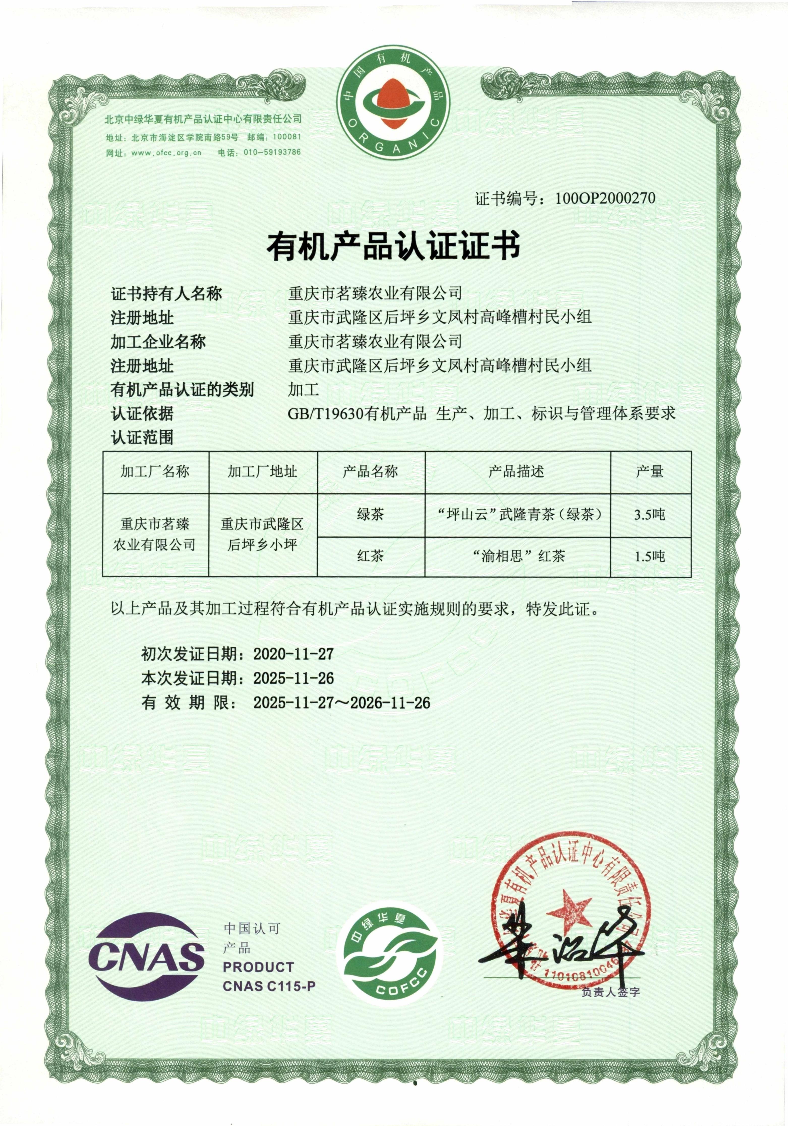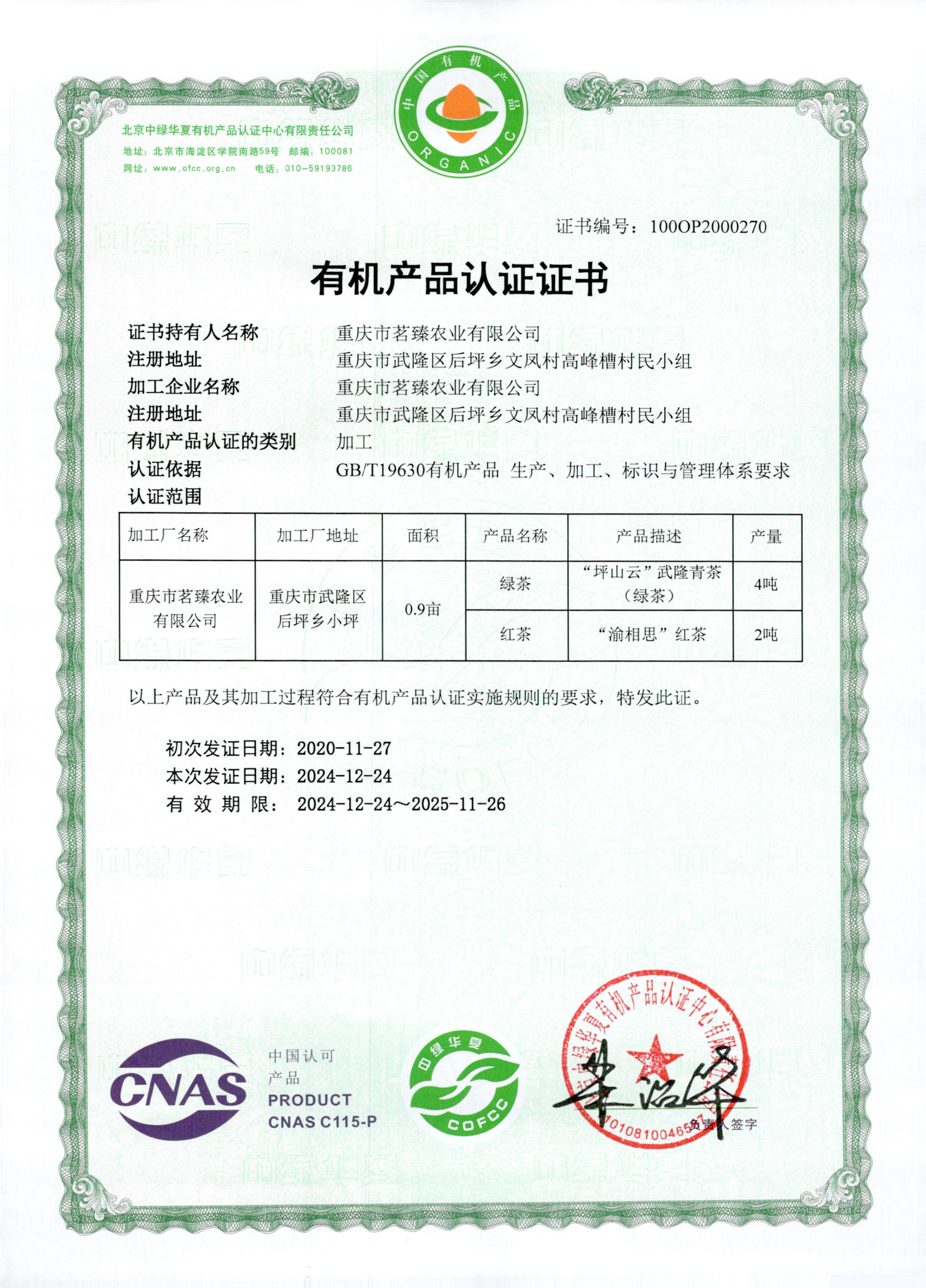 公司打造的坪山云牌武隆青茶为四川中小叶群体种,外形细紧、微卷、显毫、绿润;嫰香;汤色绿亮;滋味鲜醇爽;叶底细嫩匀,具有“热茶馥郁,冷茶清香”的独特品质。富含茶多酚13.7%、水浸出物42.8%、锌65.7毫克/千克、维生素C503毫克/千克。凭借卓越品质,公司的武隆青茶入选重庆名牌农产品名单,荣获重庆市第十三届三峡杯名优茶(绿茶类)金奖,在各类茶博会上,也屡获好评,吸引众多消费者和业内人士关注。未来,公司将持续深耕有机茶领域,以品质为基、创新为翼,推动茶产业与乡村旅游融合发展,让武隆青茶走向更广阔的市场。