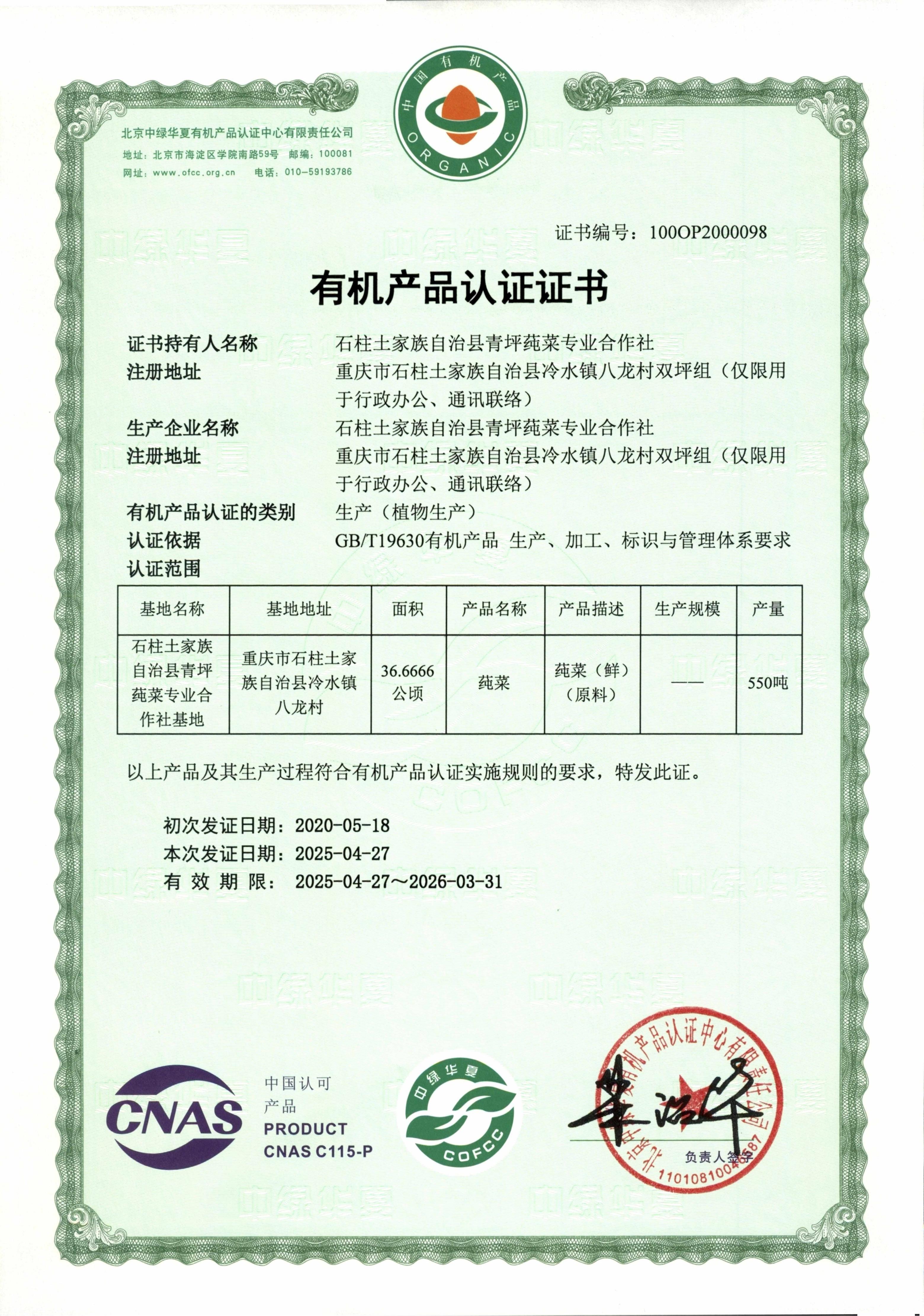 石柱土家族自治县青坪莼菜专业合作社成立于2010年,拥有有机莼菜基地550亩,生态环境良好,周边有树林作为隔离带,土壤、水 源均符合国家标准,已成为示范合作社,深受广大市民的喜爱,莼菜已通过中绿华夏有机产品认证中心认证。