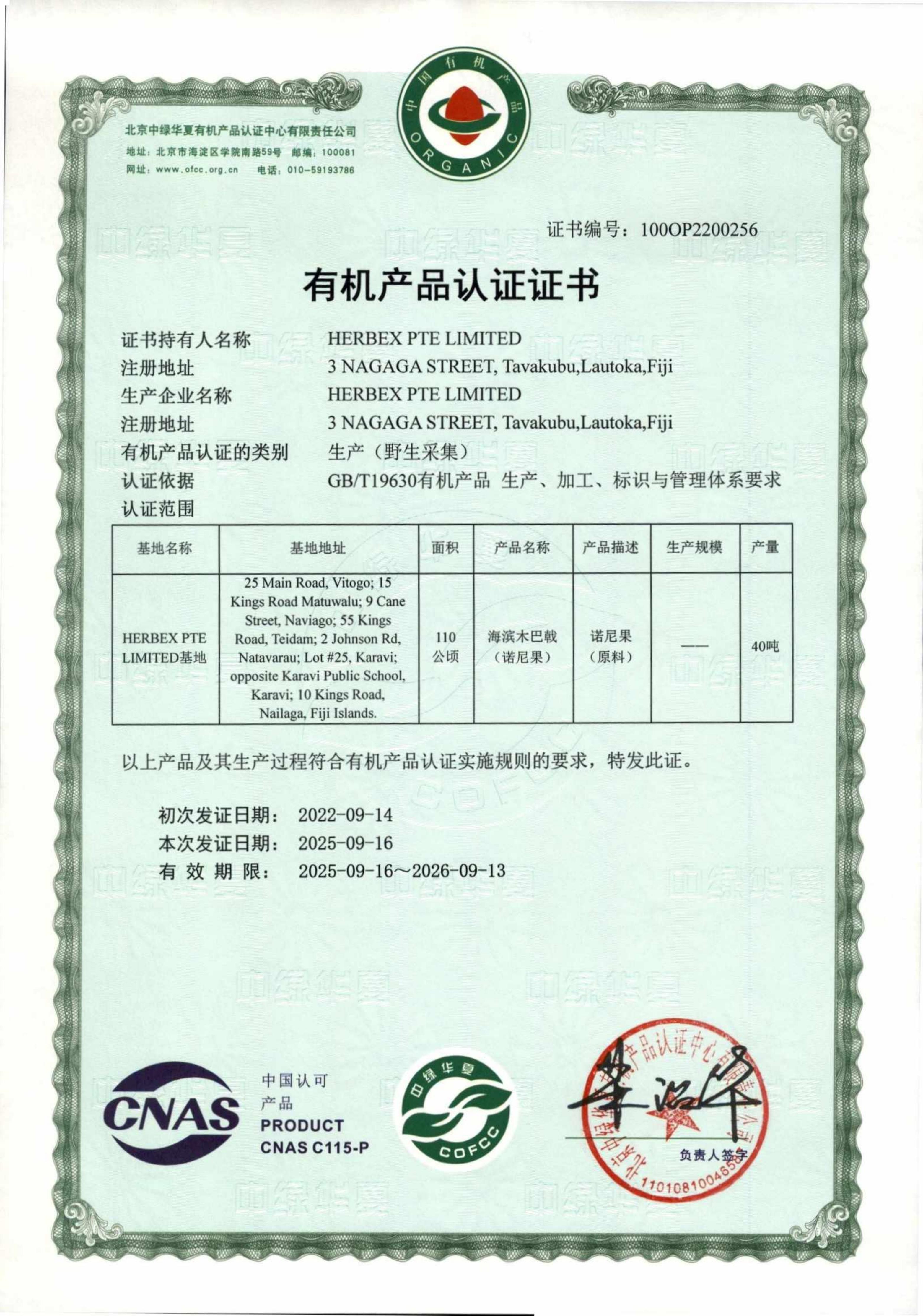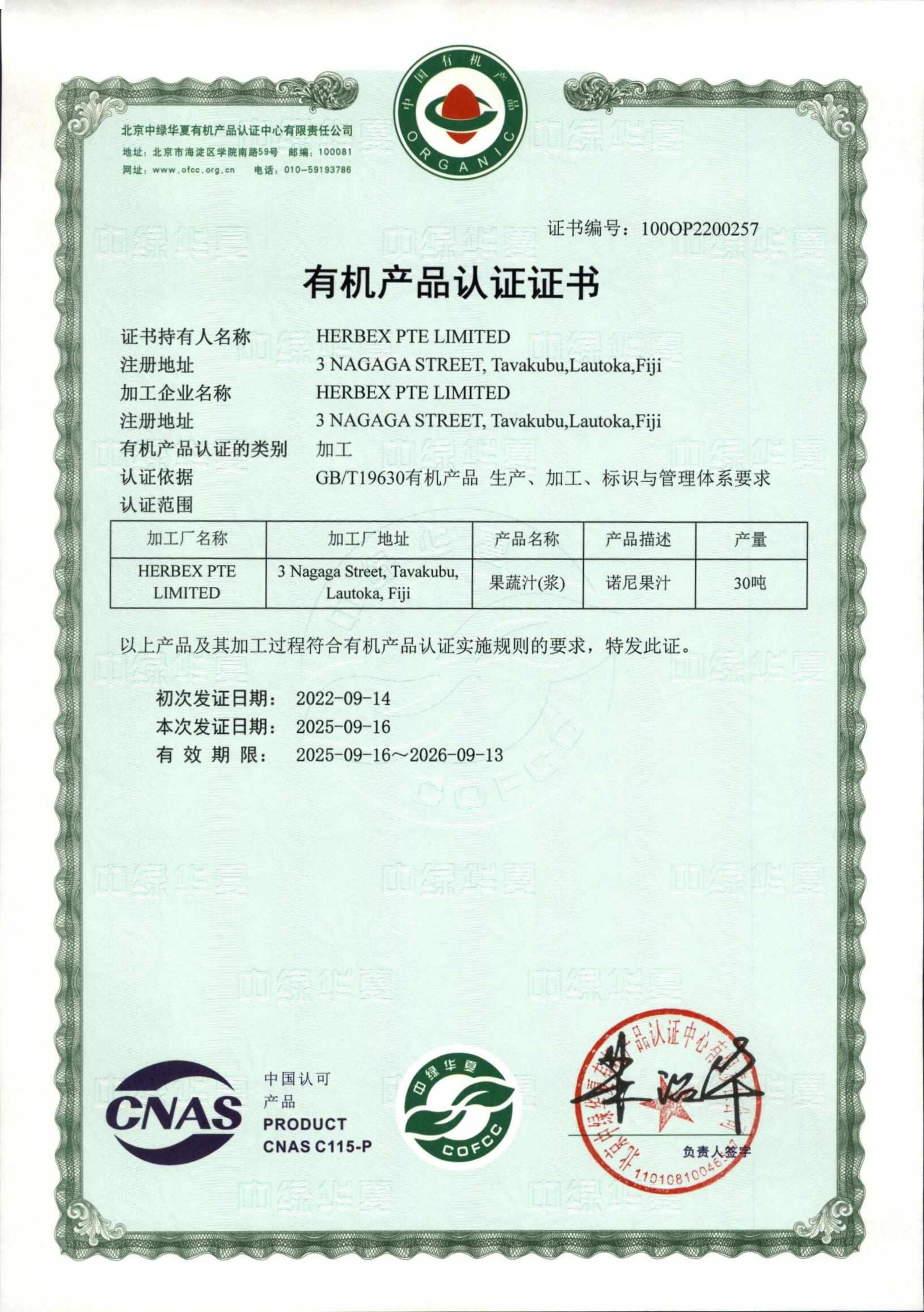 诺丽果又称海巴戟、四季果,是一种热带植物的果实,具有强烈气味,被称为“奶酪果”。诺丽果因具有药用价值,在传统医学中已 有2000多年的应用历史。诺丽果中含有维生素、矿物质、稀有元素、抗氧化物质、多糖、 酶、氨基酸、萜类化合物、多酚类化合物以及赛洛宁原等多达200多种对人体健康有利的营 养成分。诺丽果发酵原液是通过天然发酵诺丽果制 成的液态产物,发酵过程通常持续数月,发酵后的原液常呈深棕色。每日饮用,可强身健体。合百诺丽公司引进的斐济诺丽果原液经过中绿华夏有机食品认证中心严格检测鉴定,确认达到有机级别。