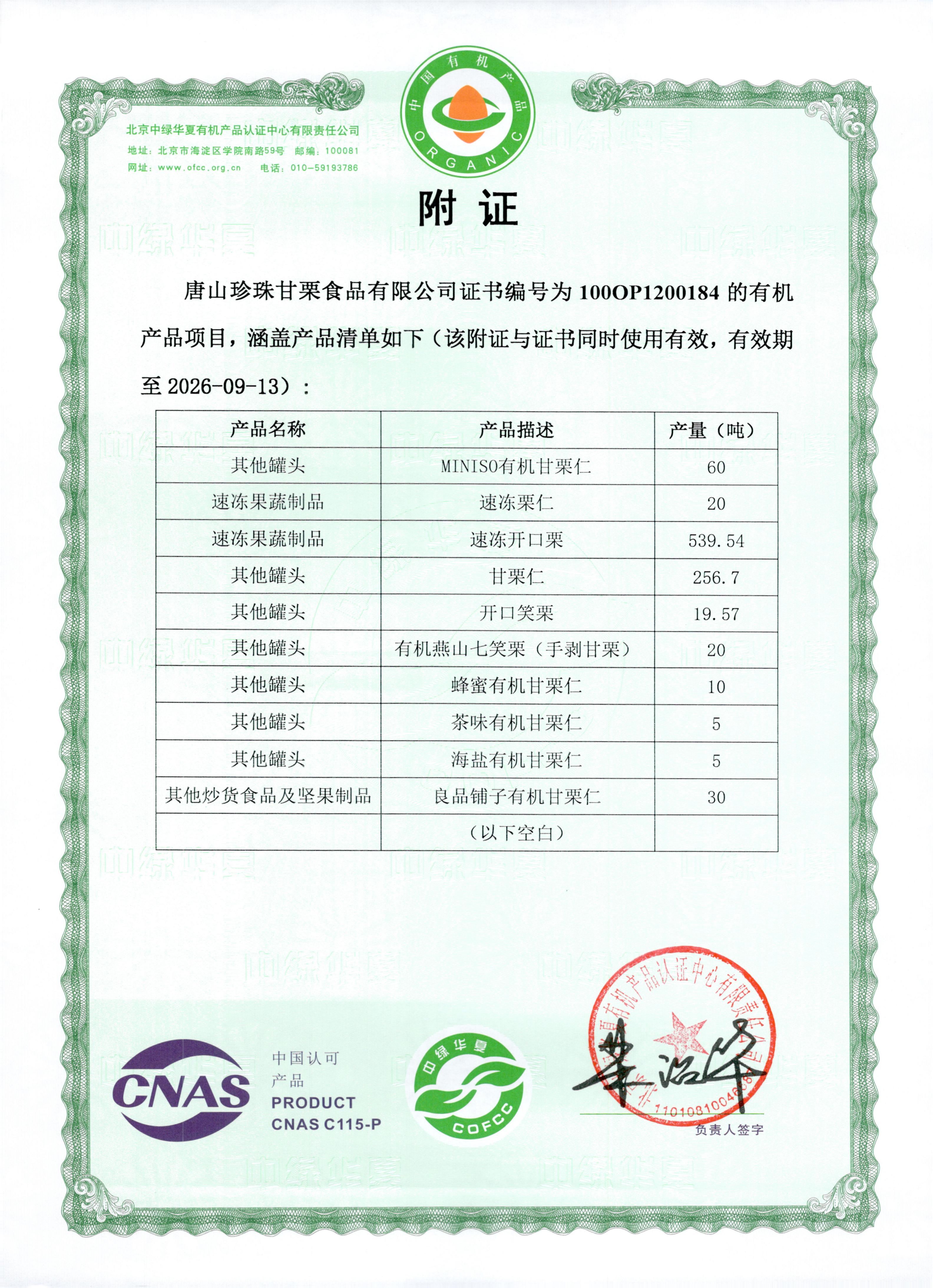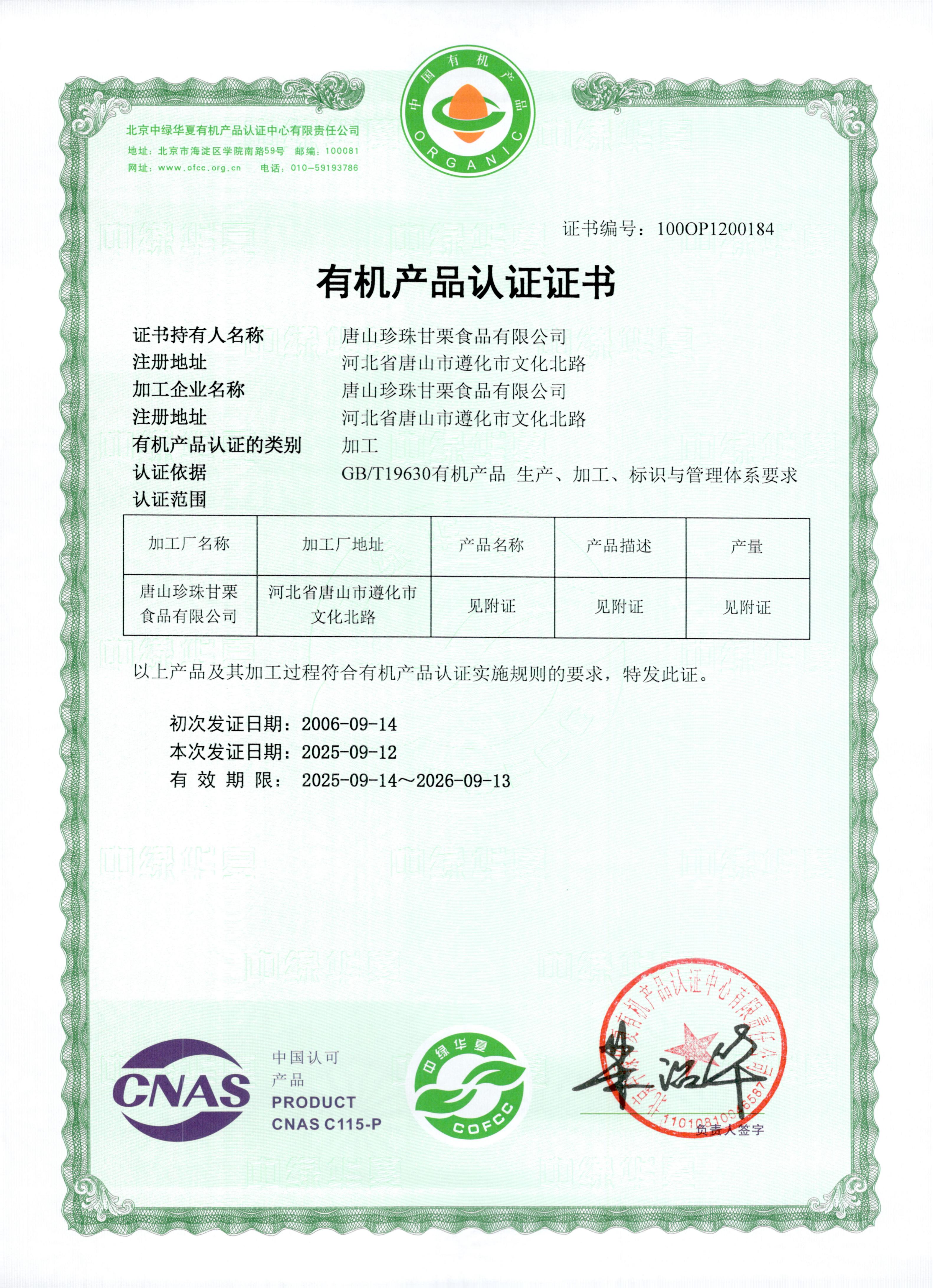 唐山珍珠甘栗食品有限公司主要经营燕山山脉优质鲜板栗及甘栗仁、开口笑等板栗深加工系列产品。板栗原材料精选于河北北部燕山深处,风味独特、肉质细腻,富含蛋白质、低聚糖、膳食纤维及铁、钙、锌等多种矿物质和微量元素,被誉为“东方食用珍珠”。公司连续通过了HACCP安全管理体系认证、中国有机食品认证、日本JAS有机认证、中国AA绿色食品认证、欧盟有机认证。