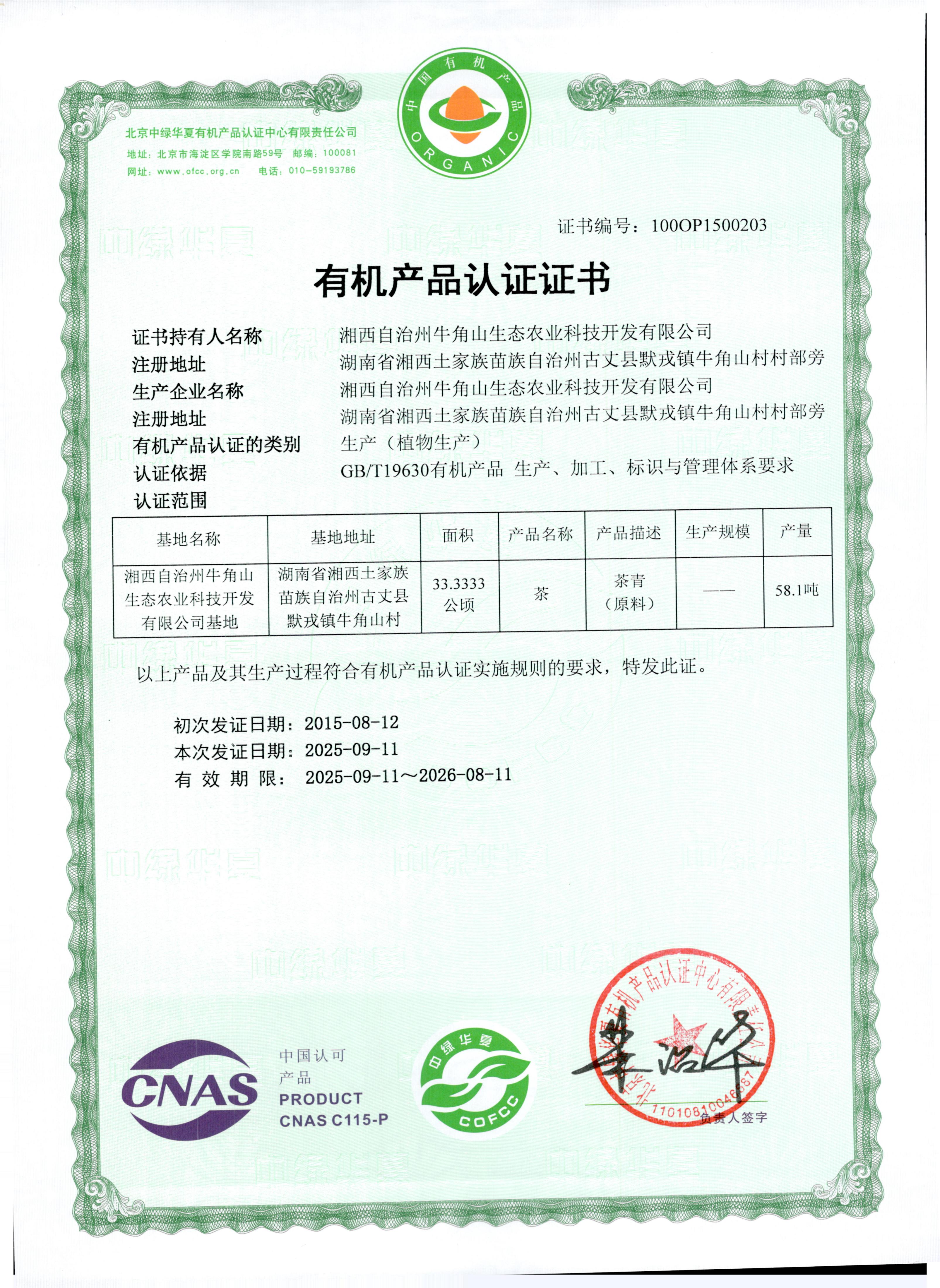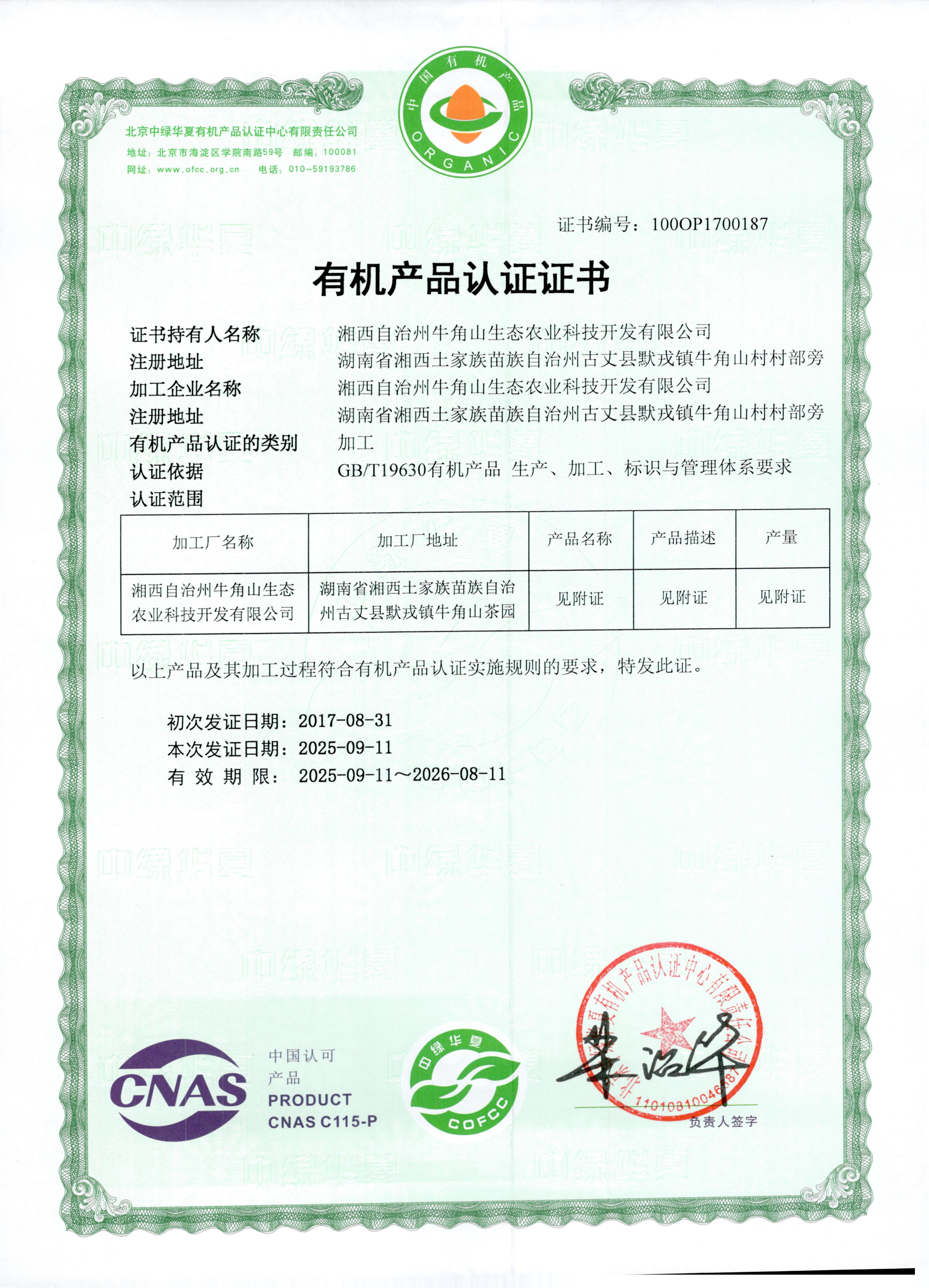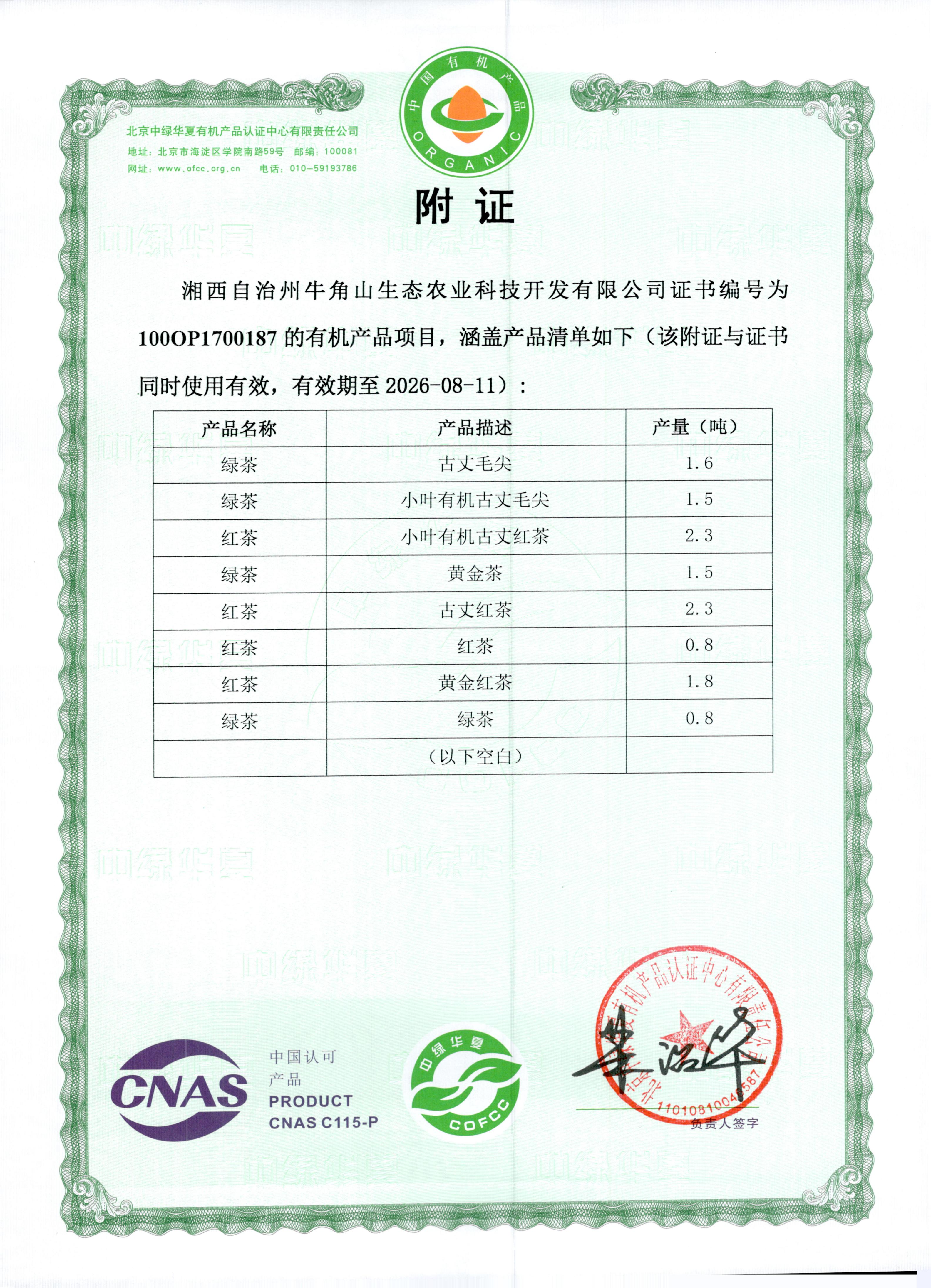 牛角山茶园地处武陵山区腹地,这里是世界公认的优质产茶带、古丈毛尖茶和黄金茶的核心产区。牛角山海拔800-1200米,开发前为天然林地,无污染史、开垦史,周围森林密布,洞溪潺爱,云雾缭绕,土壤富含磷硒,气候温和湿润,特别适合茶树生长。牛角山公司采用生态种植法,坚持自然农法原则,引进诱蛾灯,饮用山泉灌溉,严格按照有机标准进行生产。