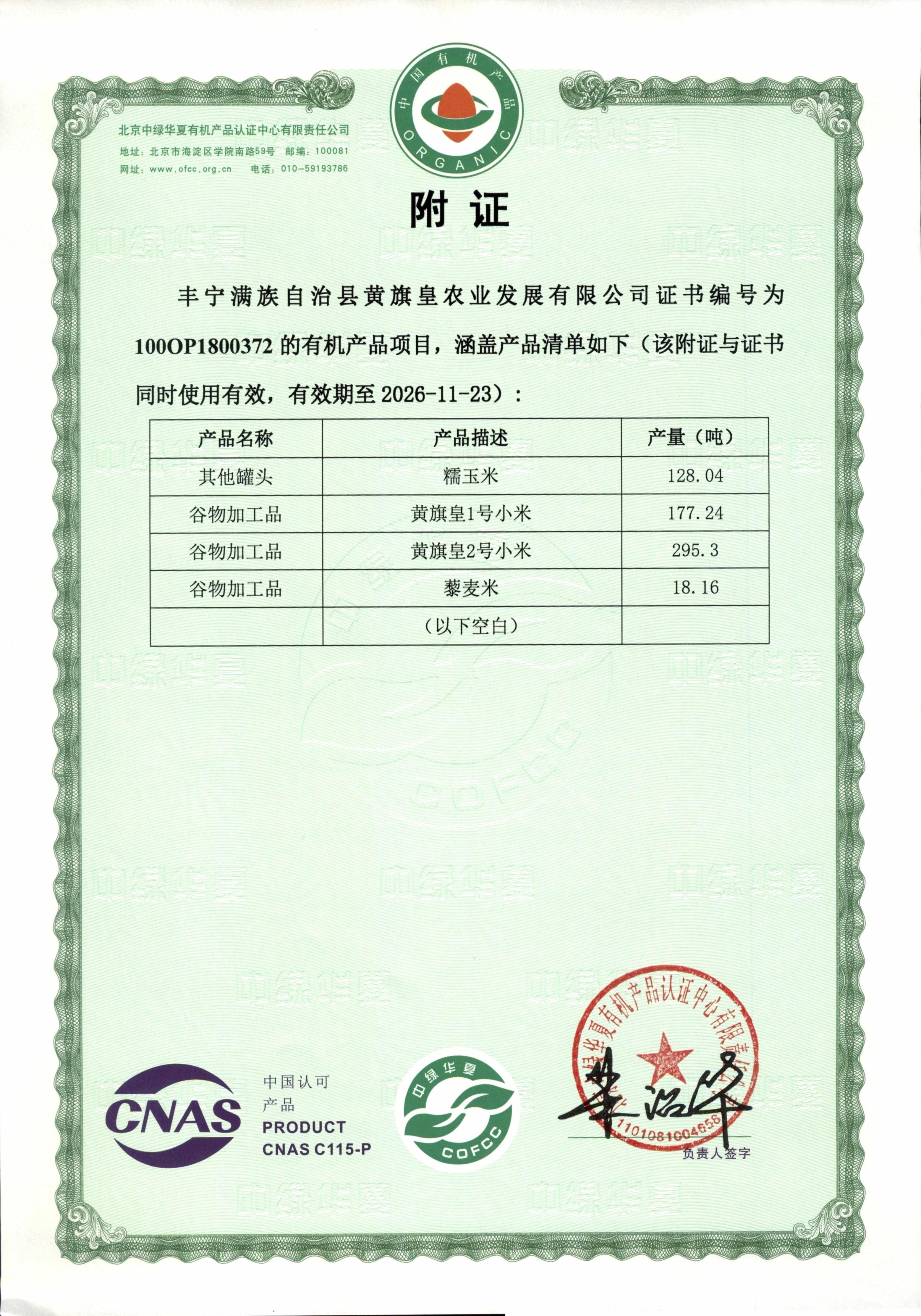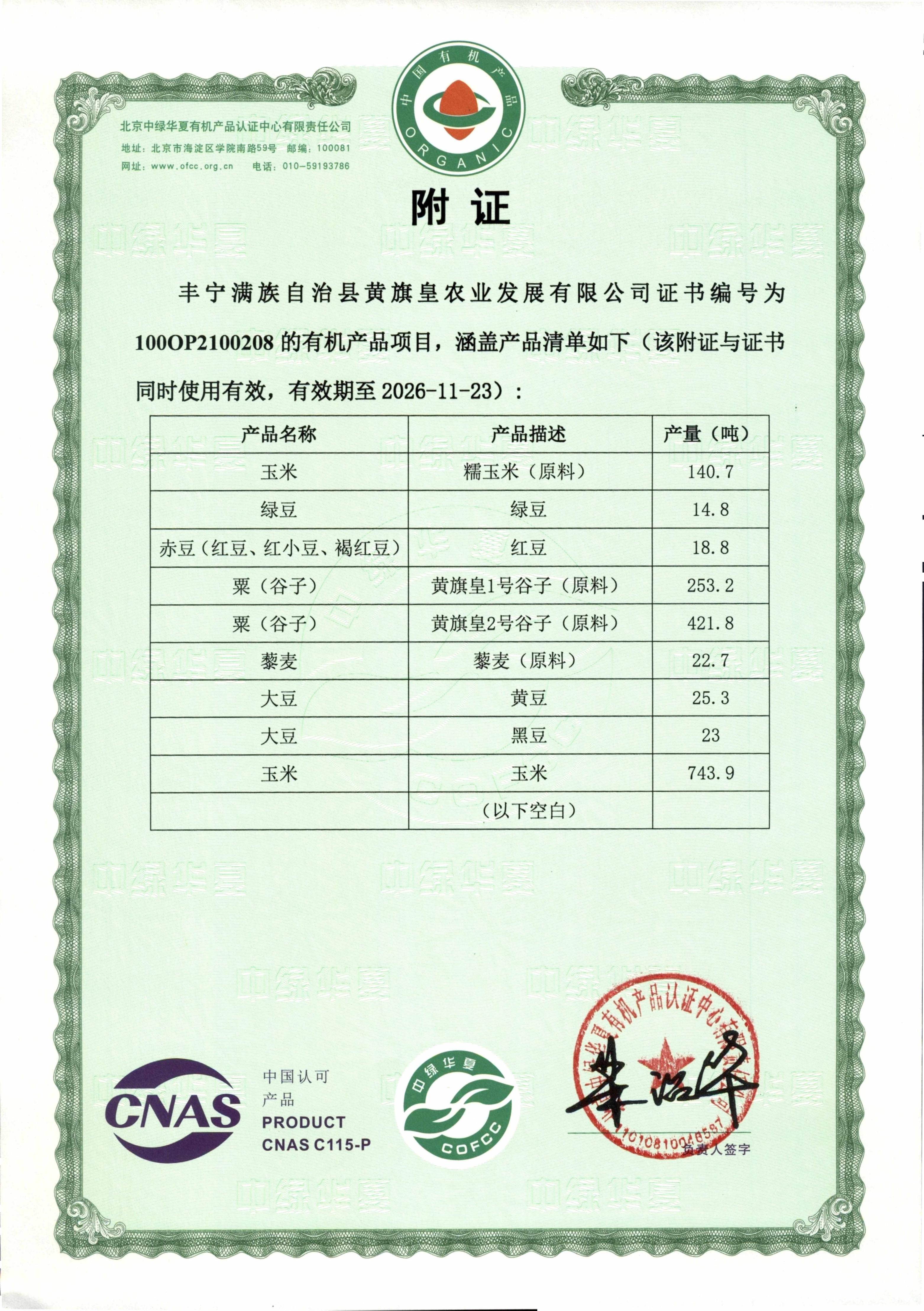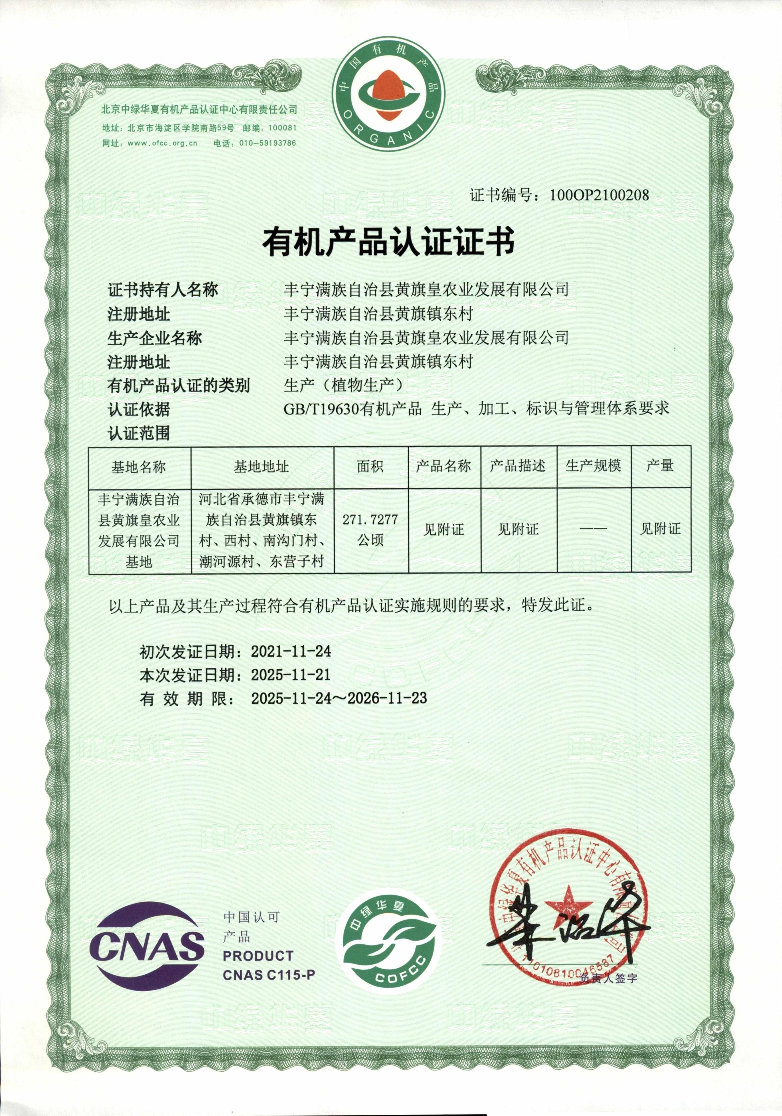 丰宁满族自治县黄旗皇农业发展有限公司利用当地这些得天独厚的自然优势和人文历史,多年来所有种植基地全部施用腐熟农家肥,谷子采用当地自选老品种,人工间苗,人工除草,人工收获,精耕细作,所有种植地块不施用农药和植物生长调节剂,自然成熟,原始耕种方法与现代农业新技术相结合。公司产品连续4年通过北京中绿华夏有机产品认证中心认证,通过发展有机种植,培育谷子特色产业,开辟了一条自然和谐的有机之路,从而保证产品品质和质量。