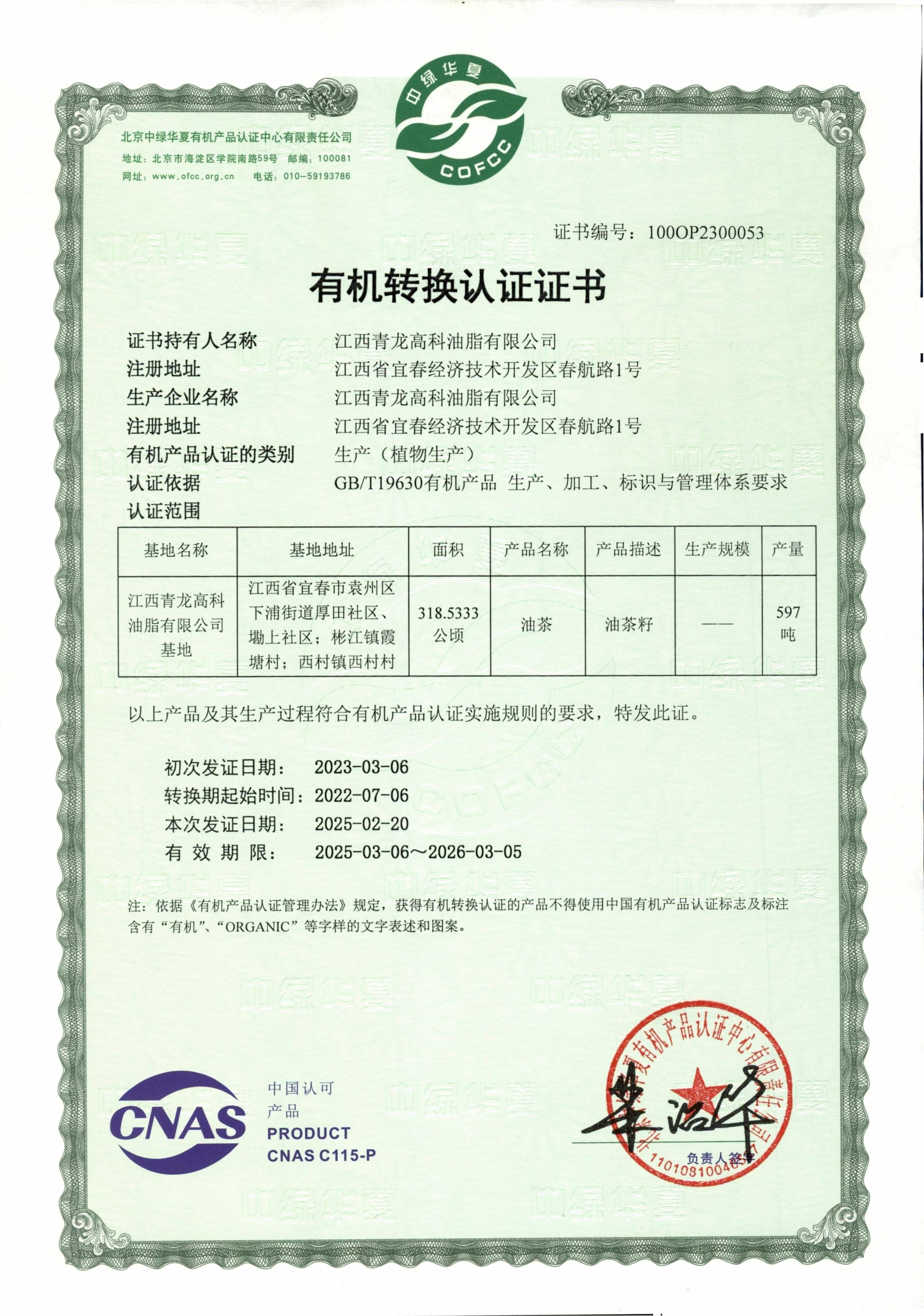 主打产品润心有机油茶籽油已通过IS09001质量体系认证,危害分析与关键控制点(HACCP)体系认证,有机食品认证,国家原产地标志保护注册,被授予“江西省质量监督系统重点保护产品"“江西省名牌产品”“中国国际有机食品博览会金奖”,产量和销售均在全国同类产品中排在前列。
