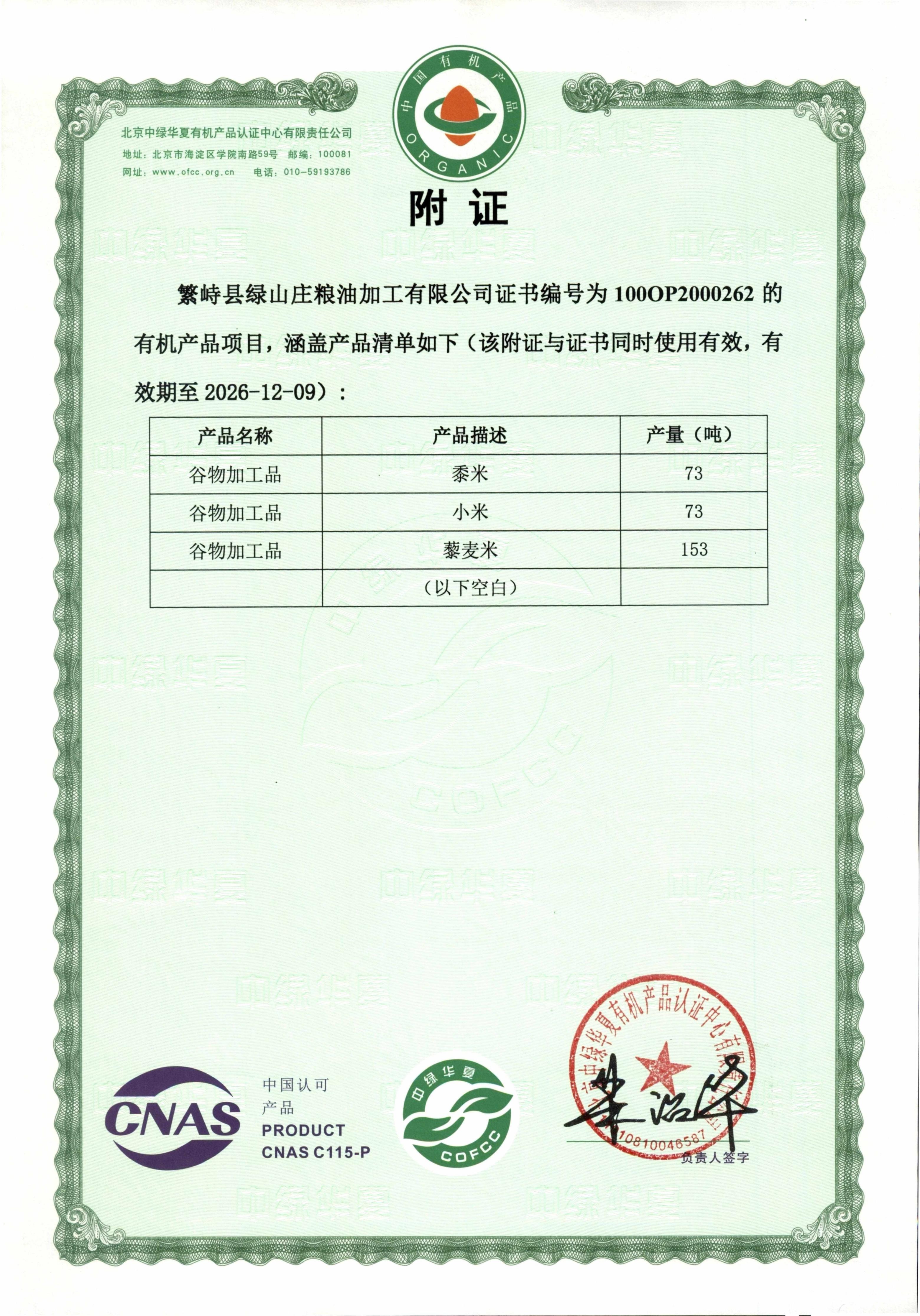 企业所种粮品有:藜麦、谷子、亚麻籽、大豆、黑豆、绿豆、苦荞、莜麦八个品种,已全部获得北京中绿华夏有机食品认证中心颁发的有机转换证书(2018、2019)。