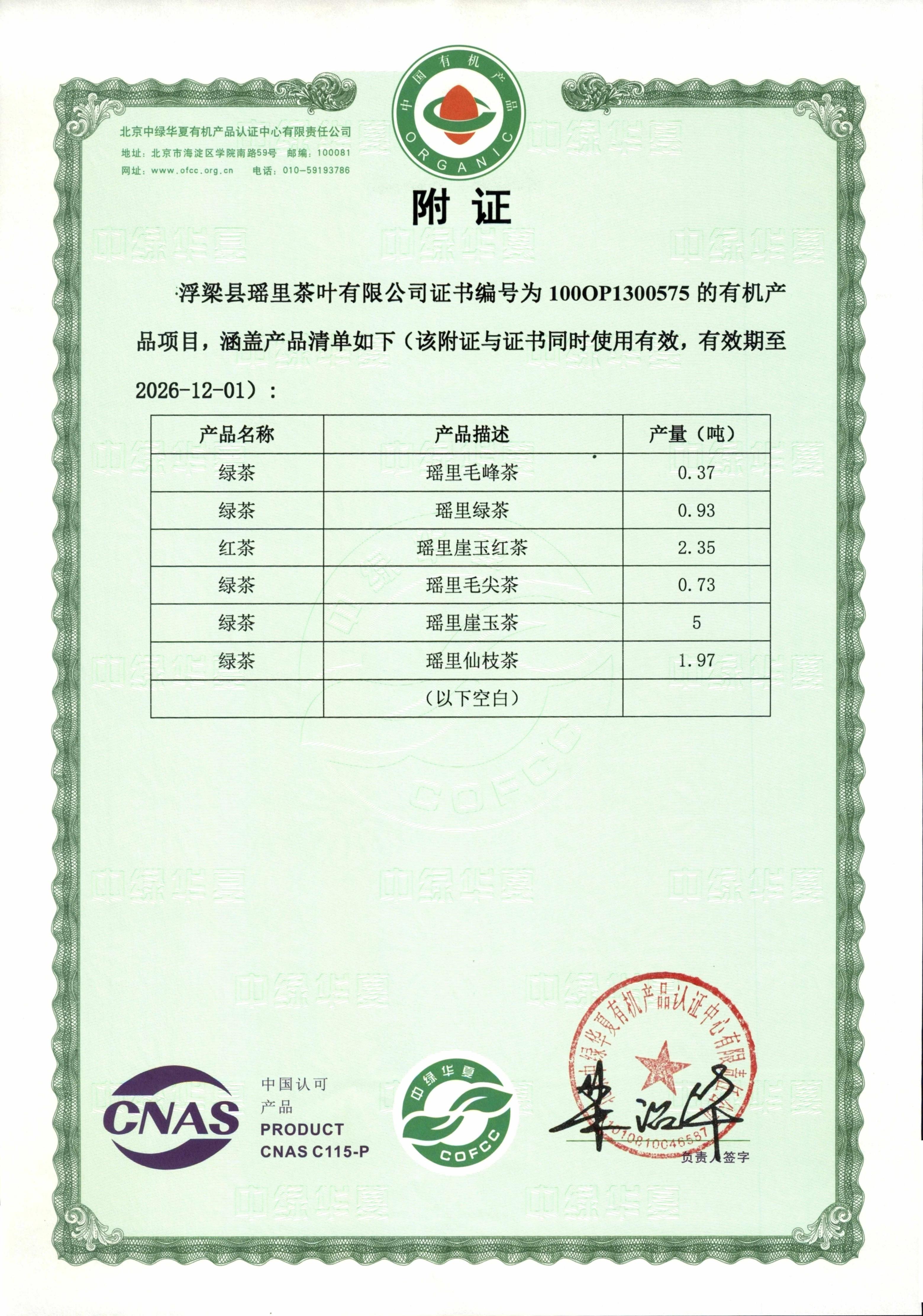 公司现有有机认证茶园2200亩,协议农户茶园面积8600亩,“崖玉”系列产品于2003年首批通过AA级绿色食品和有机食品认证。“崖玉”系列绿茶和红茶产品原料采摘于瑶里海拔600米以上的汪湖、白石塔、郑山等处的有机茶园的茶树嫩芽为原料,采用历史相传的贡茶制作工艺,小灶柴火,细心烘培,精心制作。
